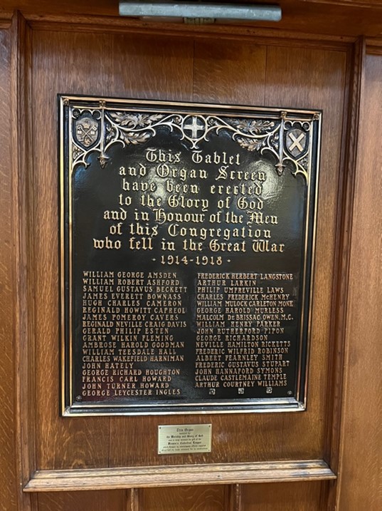 Le 20 avril 1922, un orgue et un jubé commémoratifs ont été dédiés aux membres de la congrégation qui sont morts pendant la Première Guerre mondiale. L’orgue est un instrument à trois claviers avec 26 jeux. Il est installé dans un jubé en chêne qui porte la plaque en hommage à ceux qui sont morts pendant la Première Guerre mondiale et une plaque à la mémoire de ceux honorés par les jeux du nouvel orgue. Les membres de la congrégation ont demandé les jeux en souvenir des amis et proches défunts.
