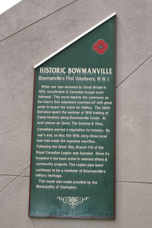 La fresque murale de la Première Guerre mondiale a été érigée par la municipalité de Clarington. Lorsque la Grande-Bretagne a déclaré la guerre en 1914, le recrutement de troupes canadiennes a suivi peu après. Cette murale illustre la cérémonie au cours de laquelle les premiers soldats volontaires de la ville ont marché avec une grande fierté pour monter à bord des trains à destination d’Halifax. Le 136e Bataillon a passé l’été 1916 à s’entraîner au Camp Hoskins, le long du ruisseau Bowmanville. Dans des endroits comme Ypres, la Somme et Vimy, les Canadiens ont acquis une réputation de bravoure. À la fin de la guerre, le 11 novembre 1918, 63 hommes de la Ville avaient fait le sacrifice suprême.