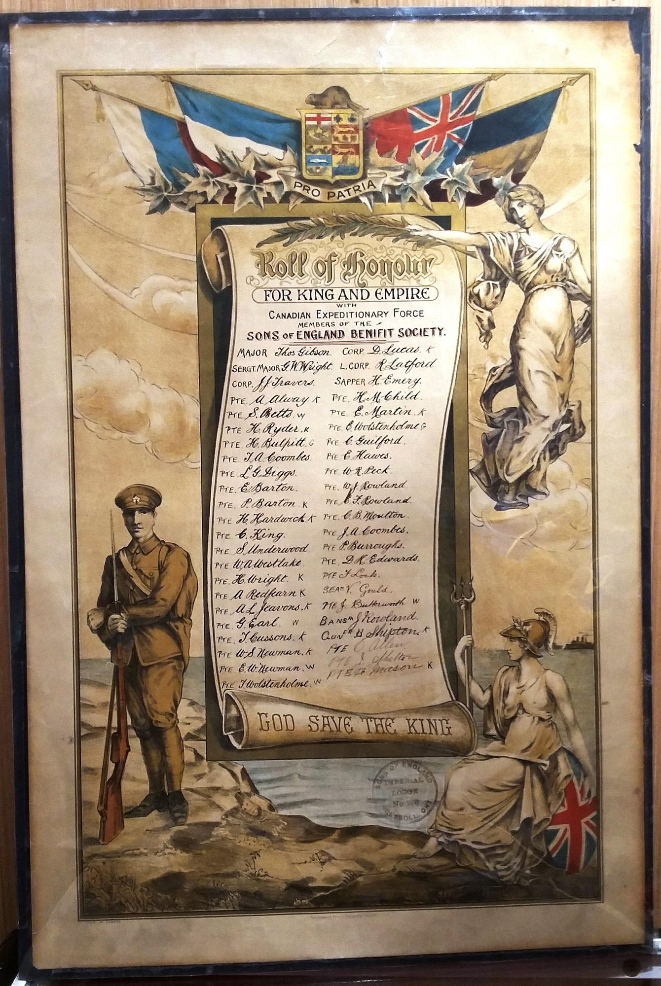 Les noms des membres de la Ingersoll Sons of England Benefit Society qui ont servi pendant la Première Guerre mondiale figurent sur ce tableau d’honneur. Il a été installé dans le bâtiment de l’Independent Order of Odd Fellows, situé au 147, rue Thames Sud, à Ingersoll. L’association Sons of England utilisait une salle pour ses réunions, et le tableau d’honneur a été offert au musée en 1990 par la veuve du secrétaire de longue date de la Ingersoll Sons of England Benefit Society et ancien maire d’Ingersoll, Alex Edmonds.