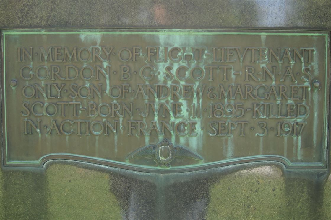 IN MEMORY OF FLIGHT LIEUTENANT GORDON B. SCOTT R.N.A.S. ONLY SON OF ANDREW AND MARGARET SCOTT. BORN JUNE 14 1895 KILLED IN ACTION, FRANCE SEPT. 3, 1917.