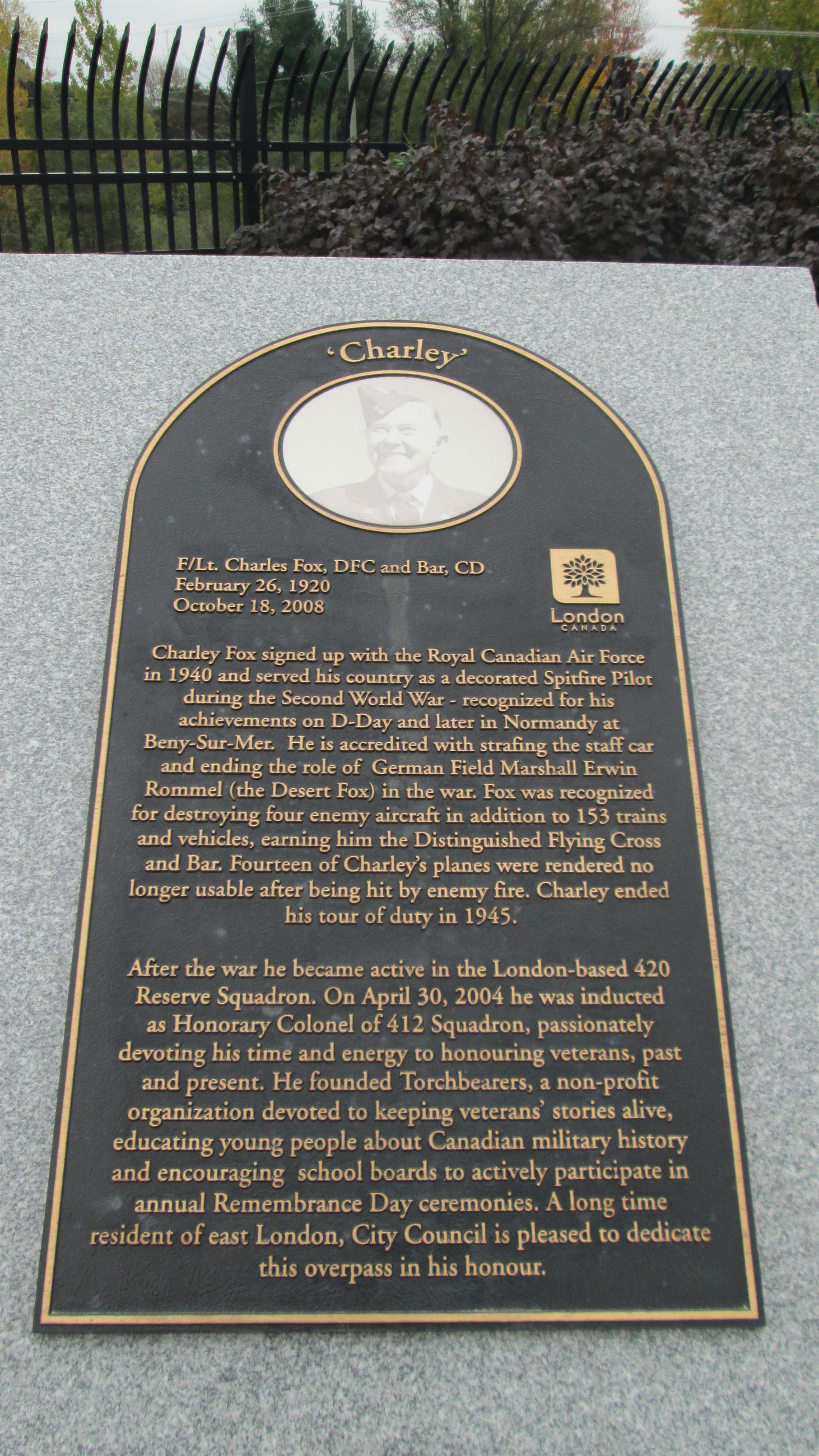 Cette passerelle est ainsi nommée en l’honneur du capitaine d’aviation Charles Fox, D.F.C. avec agrafe, C.D.