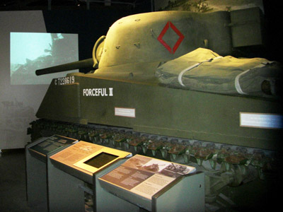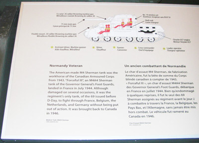 Le char d'assaut M4 Sherman, de fabrication américaine, fut la bête de somme du Corps blindé canadien à compter de 1943.« Forceful III », un char d`assaut M4A4 Sherman des Governor General`s Foot Guards, débarqua en France en juillet 1944. Bien qu`endommagé à quelques reprises, il fut le seul des 69 Sherman assignés au régiment avant le jour J à combattre à travers la France, la Belgique, les Pays Bas, et l`Allemagne, sans jamais être mis hors de combat. Le véhicule fut ramené au canada en 1946.