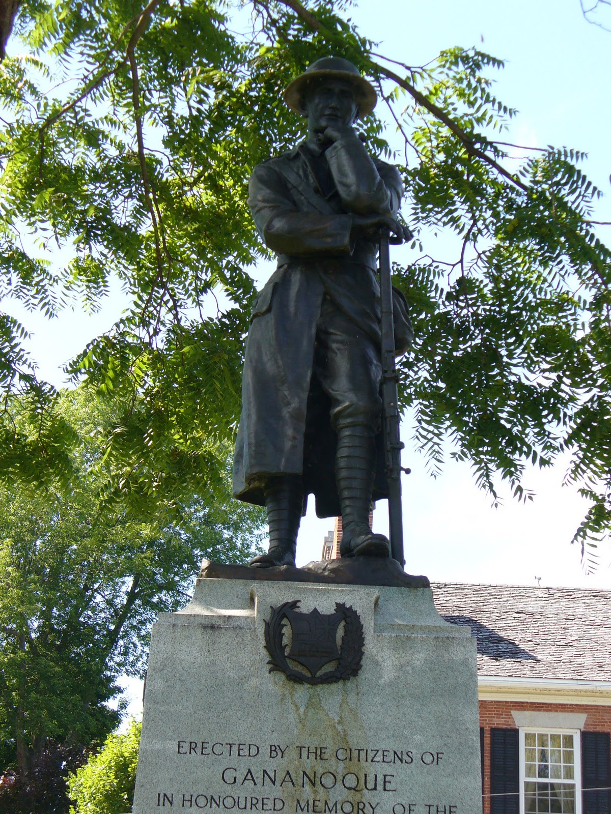 Le cénotaphe de Gananoque a été inauguré par des citoyens locaux le 15 décembre 1920. La statue en laiton au sommet représente un soldat au repos, appuyé sur son fusil. La société canadienne William A. Rogers Limited a publié un catalogue de modèles de monuments commémoratifs, dont la statue grandeur nature d’un fantassin pensif, appuyé sur son fusil, le menton posé sur sa main. Rogers était, à l’époque, la seule fonderie de bronze au Canada qui avait réussi à faire de grands moulages comme celui-ci. L’œuvre est un moulage d’après un modèle réalisé par un sculpteur de Saint-Boniface nommé Nicolas Pirroton
