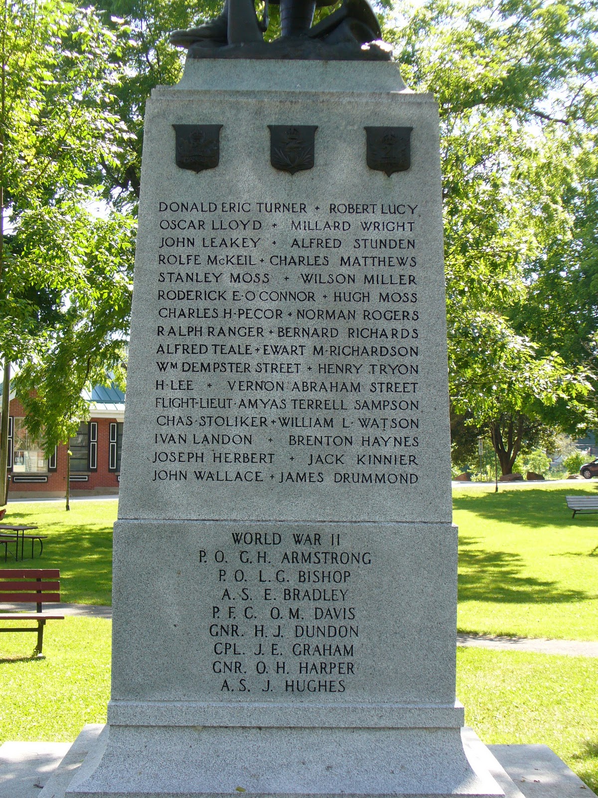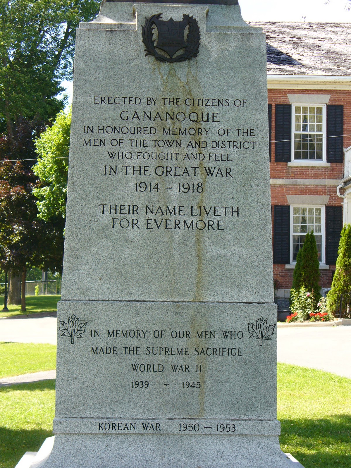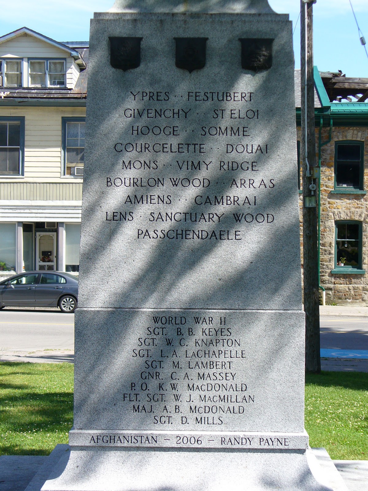 Le nom des 25 morts locaux de la Seconde Guerre mondiale a été ajouté en 1946. En 2005, le cénotaphe a été restauré. Le nom du caporal Randy Payne, tué en Afghanistan, a été ajouté en 2006 et le cénotaphe a été inauguré de nouveau en 2007. En 2016, un tablier d’autobloquants en pierre a été ajouté autour du cénotaphe par souci d’accessibilité. L’idée du tablier en pierre est venue de Neil McCarney de la Gananoque Boat Line. Le nom du sergent de section William Macmillan, un parent de Neil McCarney, est gravé sur le monument commémoratif. L’ouvrage en pierre a été financé par la filiale de la Légion de Gananoque et une contribution de la Gananoque Boat Line. Paul Doornbos, de Thornbusch Landscaping près de Lansdowne, l’architecte paysagiste qui l’a installé, a fait don de son travail. C’était sa contribution pour ses parents qui sont venus des Pays-Bas au Canada. Deux soldats locaux, le soldat Bernard Sanders et le lieutenant Paul Sampson, ont été tués au cours des dernières semaines de la guerre et sont enterrés dans le cimetière de guerre canadien de Groesbeek, aux Pays-Bas.