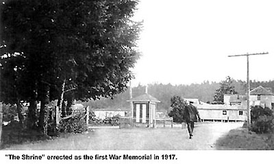 Le premier mémorial militaire érigé à cet endroit était une structure de bois portant les noms des combattants et des morts sur de grands panneaux blancs placés deux par deux sur chacun des quatre côtés du mémorial. Les noms de tous les hommes et de toutes les femmes au service de leur pays étaient inscrits sur ce « sanctuaire », et y étaient ajoutés au fur et à mesure des nouvelles arrivées. Ceux des morts étaient marqués d’une croix. (Un ouvrage de maçonnerie permanent a été déménagé au centre du parc commémoratif, alors en cours d’aménagement.) Au début de la Première Guerre mondiale, l’île Saltspring comptait environ 1 000 habitants. De ce nombre, 150 hommes et femmes se sont enrôlés dans les forces armées; neuf ont perdu la vie - deux dans la MRC, trois dans l’Armée et quatre dans l’ARC ou la RAF. Il y a 79 ans depuis 1996, le premier service du jour du Souvenir avait lieu à l’île Saltspring. Depuis 1931, ces cérémonies sont organisées et dirigées par la filiale no 92 de la Légion royale canadienne. D’autres cérémonies ont également eu lieu au cénotaphe, notamment pour commémorer le débarquement et la victoire en Europe. (C’est également là qu’a lieu la cérémonie annuelle du lever du drapeau du Canada.)