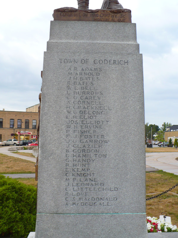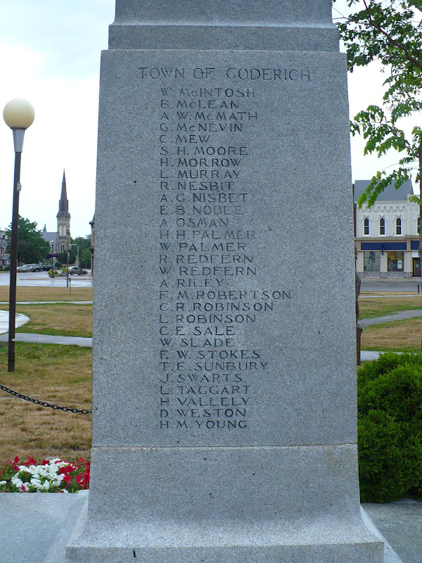 Ce mémorial est dédié aux habitants de Goderich qui ont donné leur vie pendant la Seconde Guerre mondiale. Il a été érigé en 1924 par le club nautique et les citoyens de Goderich. Il fait face à l’est, vers la rue où les soldats défilaient avant de prendre le train pour se rendre à l’entraînement.