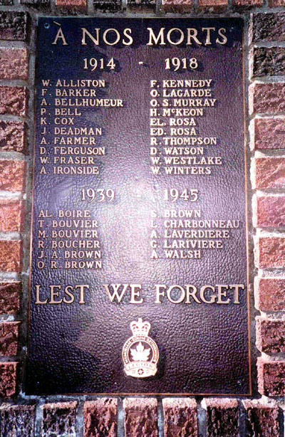 Ce mémorial a été construit en 1985 pour la filiale 173 de la Légion royale canadienne par Bob Hickox, un de ses membres. Il est dédié aux citoyens de la région qui sont morts lors des Première et Seconde Guerres mondiales. Sous l'inscription se trouve le symbole de la Légion royale canadienne.