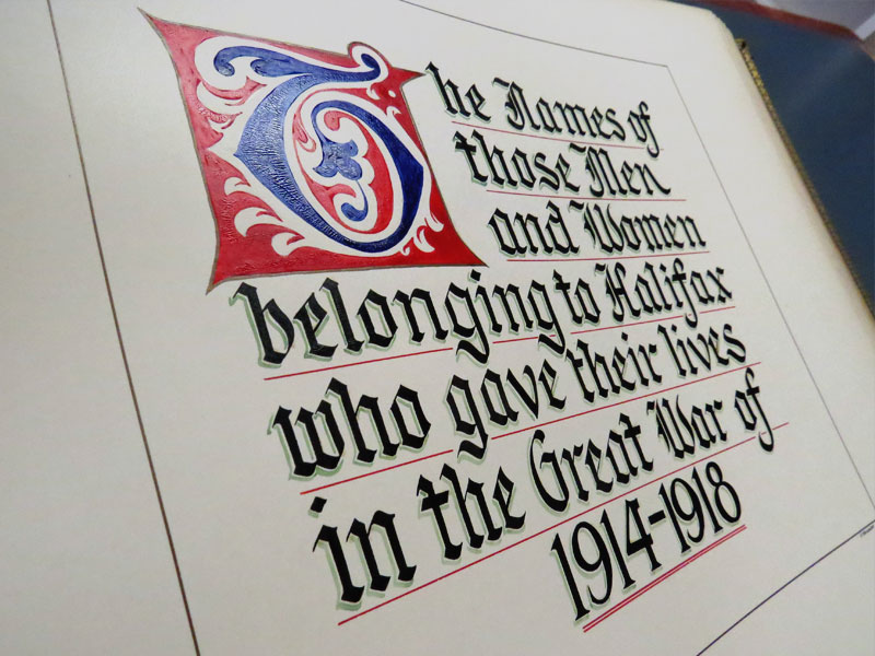 Ce Livre commémore les 1 360 hommes et femmes du comté de Halifax qui ont donné leur vie pendant la Première Guerre mondiale et indique la cause et la date de leur décès. Il a été officiellement dédié à la ville de Halifax ainsi qu’au Monument commémoratif de guerre lors du grand défilé du 1er juillet 1929.