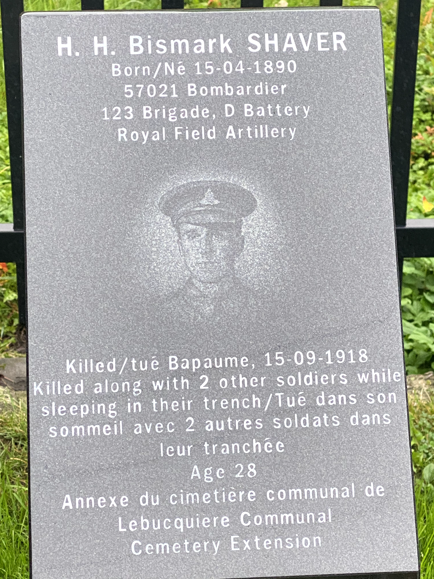 Le comité du cénotaphe de Morewood a rendu hommage à ceux qui sont tombés au champ d’honneur le jour du centenaire, le 6 juillet 2021, en installant 21 mini-monuments – dix le long de chaque côté – soit un pour chacun de ceux qui ont donné leur vie, et un seul à l’arrière représentant tous ceux qui sont revenus. Un portrait de H. H. Bismark Shaver est gravé sur son monument commémoratif.