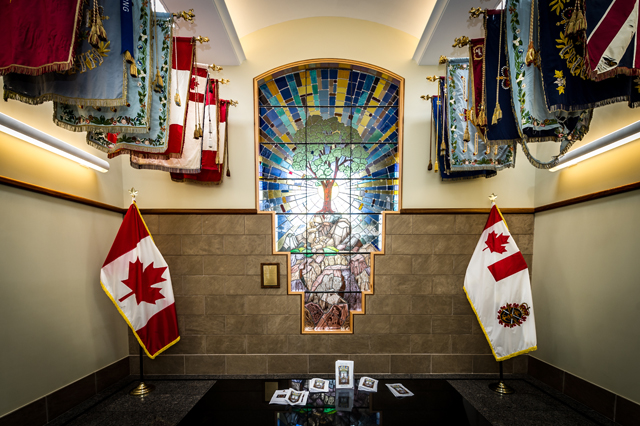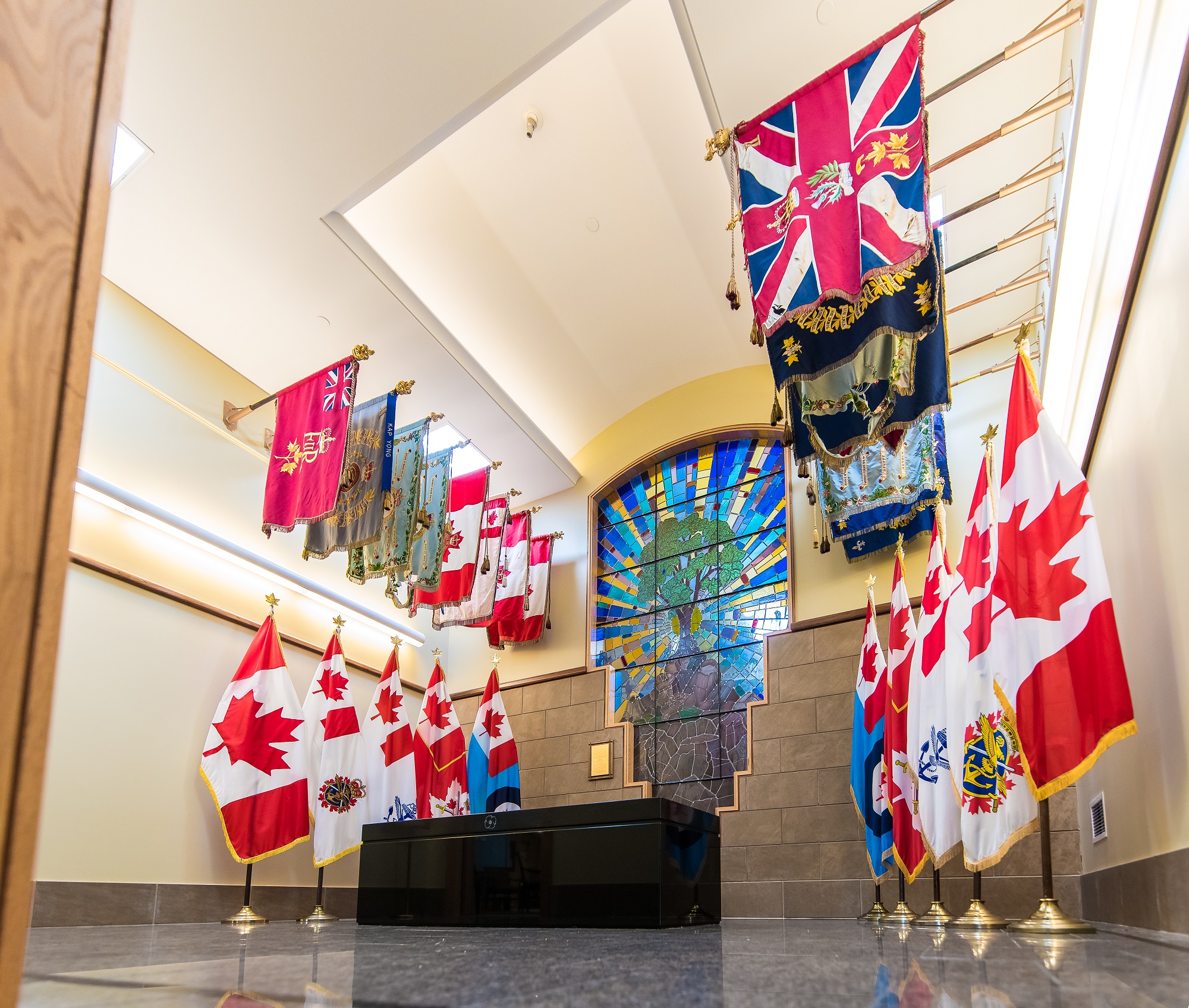 La Salle des drapeaux a été créée en 2007 comme un lieu de mise au repos digne et honorable des drapeaux d’unités. Les couleurs (drapeaux) retirées des régiments de l’armée, de la marine et de l’aviation du Canada sont fixées au plafond. Suivant la tradition, ces drapeaux resteront honorablement suspendus et intouchés jusqu’à leur désintégration complète. La zone est réservée à l’usage exclusif des militaires et des vétérans.