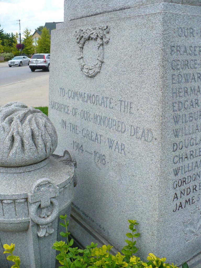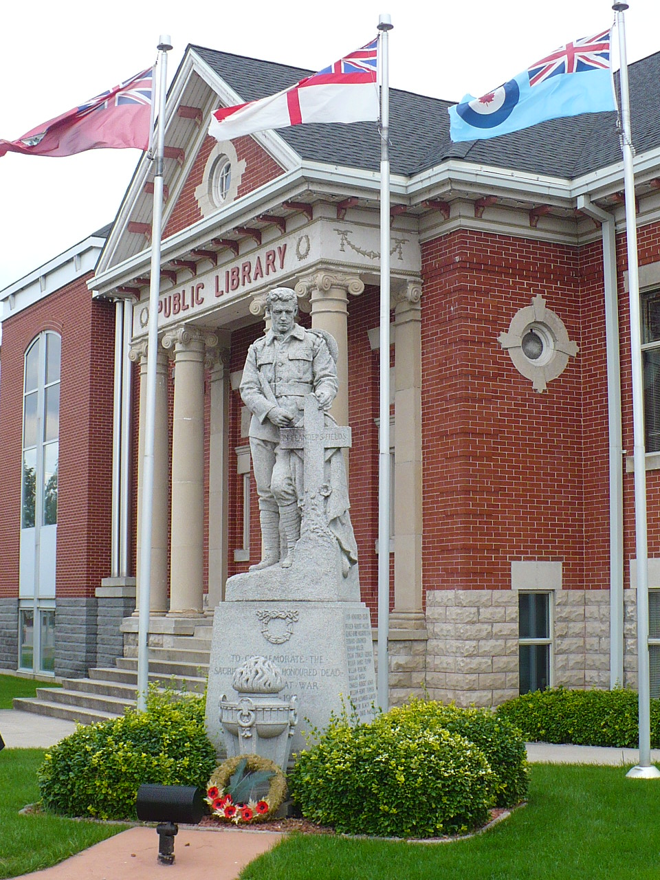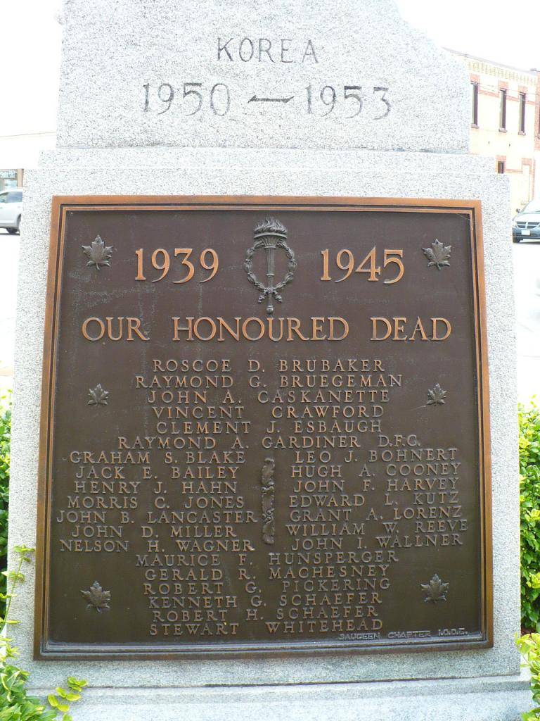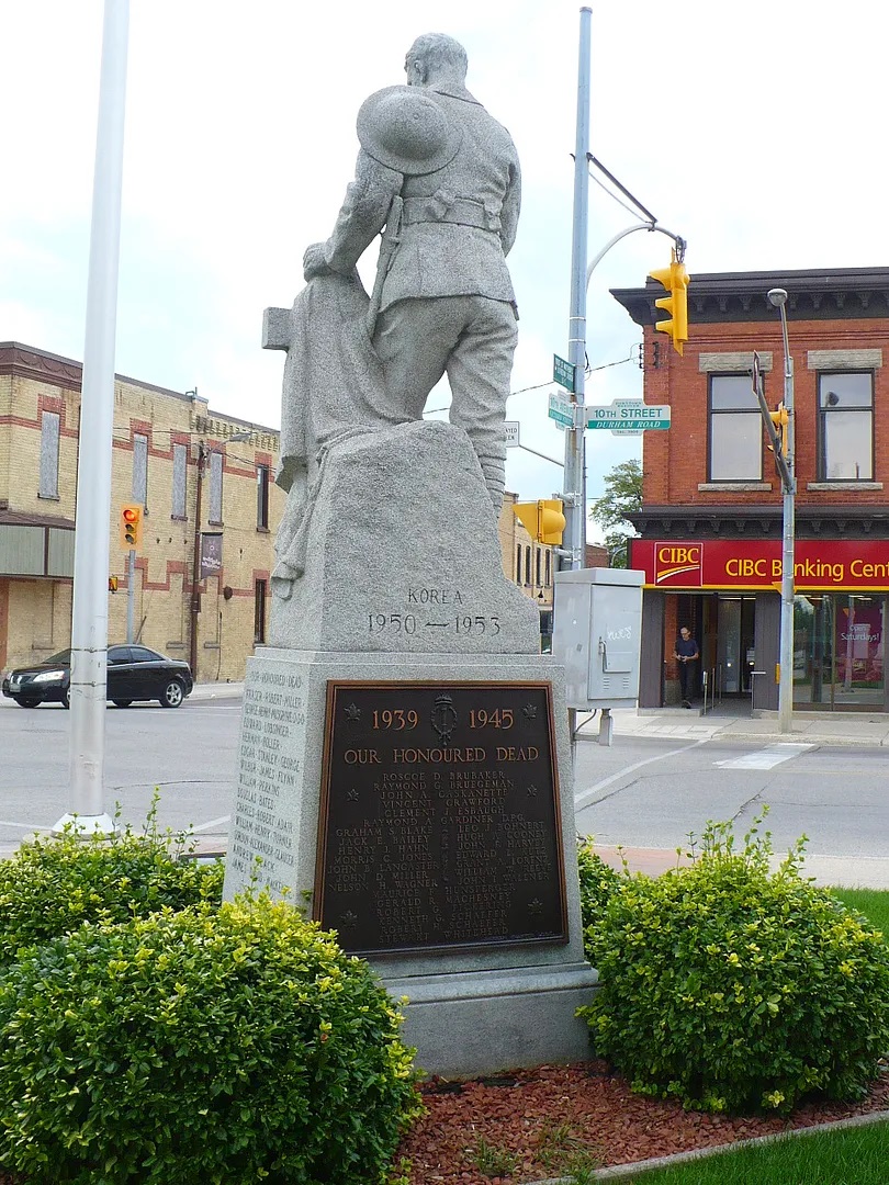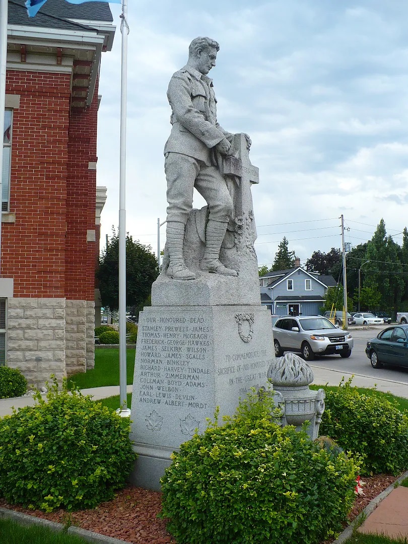 Ce mémorial dédié aux morts de la Première Guerre mondiale a été érigé en 1922. En décembre 1921, le conseil d’administration de la bibliothèque a rencontré les membres de l’Ordre impérial des filles de l’Empire (I.O.D.E.) en vue de l’érection d’un monument aux morts sur le terrain de la bibliothèque. Le conseil municipal avait accordé 500 $ à l’I.O.D.E. pour la construction de ce monument. En février 1922, un comité du conseil de la bibliothèque composé de Mlle A. Zinn, du rév. D.J. Lane, de M. James A. Magee et du maire Henry Peppler a rencontré des représentantes de l’I.O.D.E. pour établir les détails concernant l’installation du monument. En mars, le comité a autorisé l’I.O.D.E. a ériger le monument à l’angle nord-ouest du terrain de la bibliothèque. L’Institut féminin de Hanover a suggéré la construction d’un autre monument aux morts en mars 1922. Ses membres ont rencontré le conseil d’administration de la bibliothèque en vue de l’installation d’un étendard portant les noms des citoyens de Hanover enrôlés pendant la Première Guerre mondiale. Cet étendard a été installé sur le mur sud de la salle de lecture des hommes.