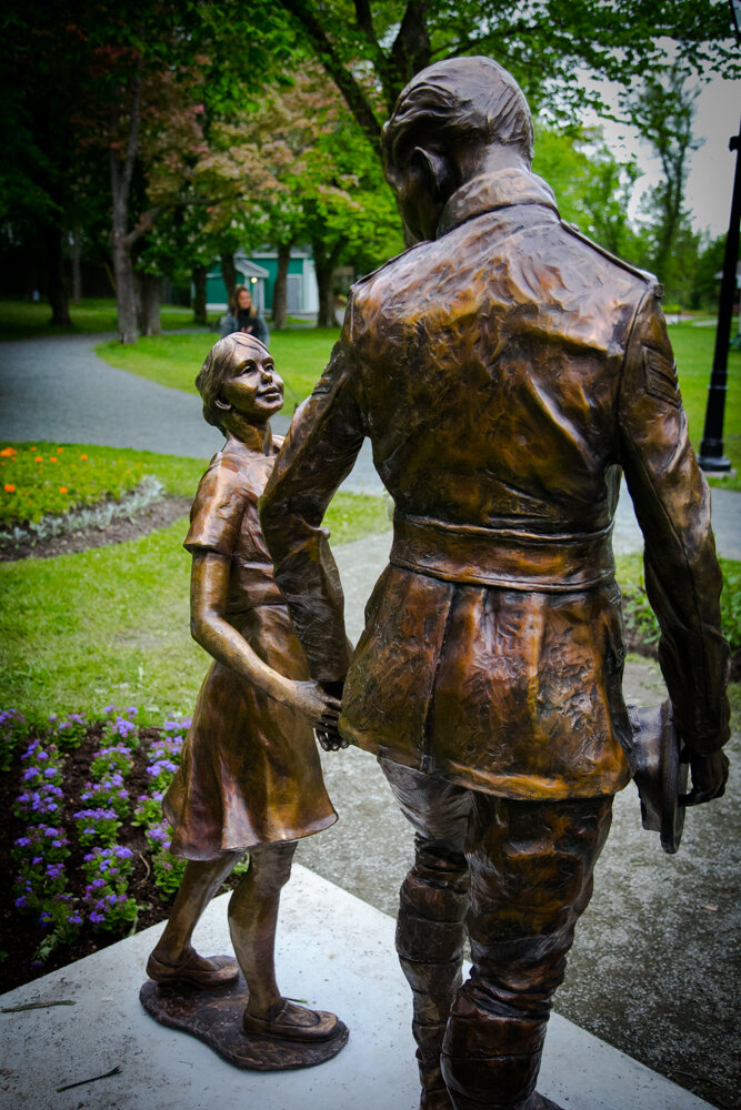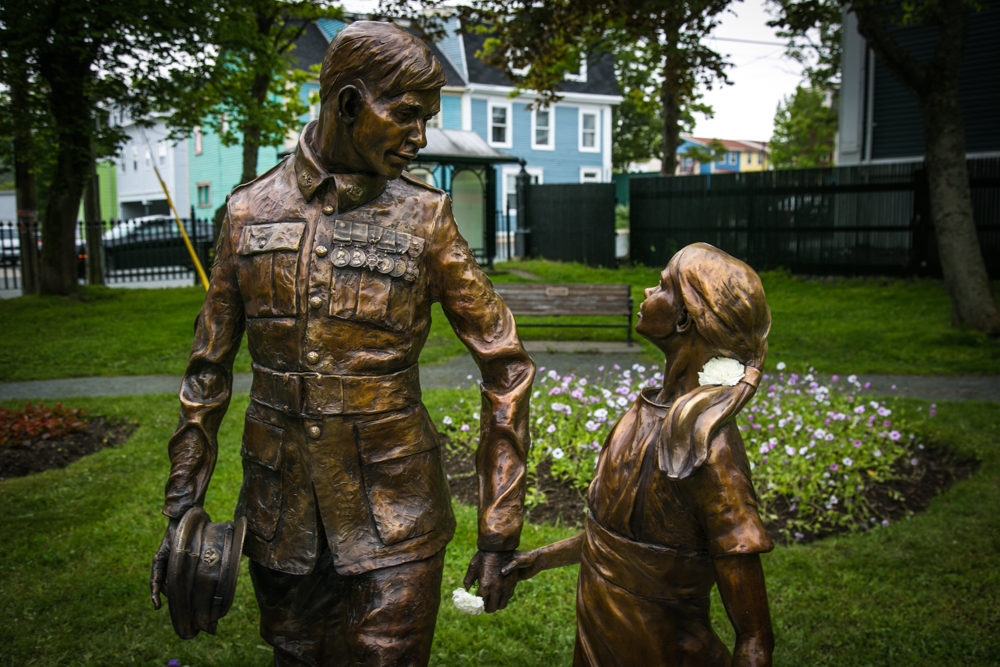 Le monument The Homecoming présente la statue en bronze d’un soldat du Royal Newfoundland Regiment en uniforme, tenant près de sa hanche sa casquette avec l’insigne de la tête de caribou. Il lui manque un morceau d’oreille – un rappel de la guerre et de la balle qui l’a touché en passant à côté de sa tête. Il tient la main d’une jeune enfant souriante, sa fille.