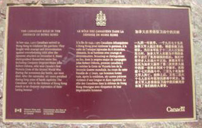 Le mémorial constitué d'un rocher et d'une plaque se trouve à proximité du Mur commémoratif de Hong Kong et décrit le rôle des canadiens dans la défense de Hong Kong. Le mémorial dévoilé par la Commission des lieux et monuments historiques du Canada vers environ le 15 août 2009, dédié à tout les canadiens qui ont participés et tout ceux qui on sacrifié leur vie à la défense de Hong Kong durant la Seconde Guerre Mondiale.
