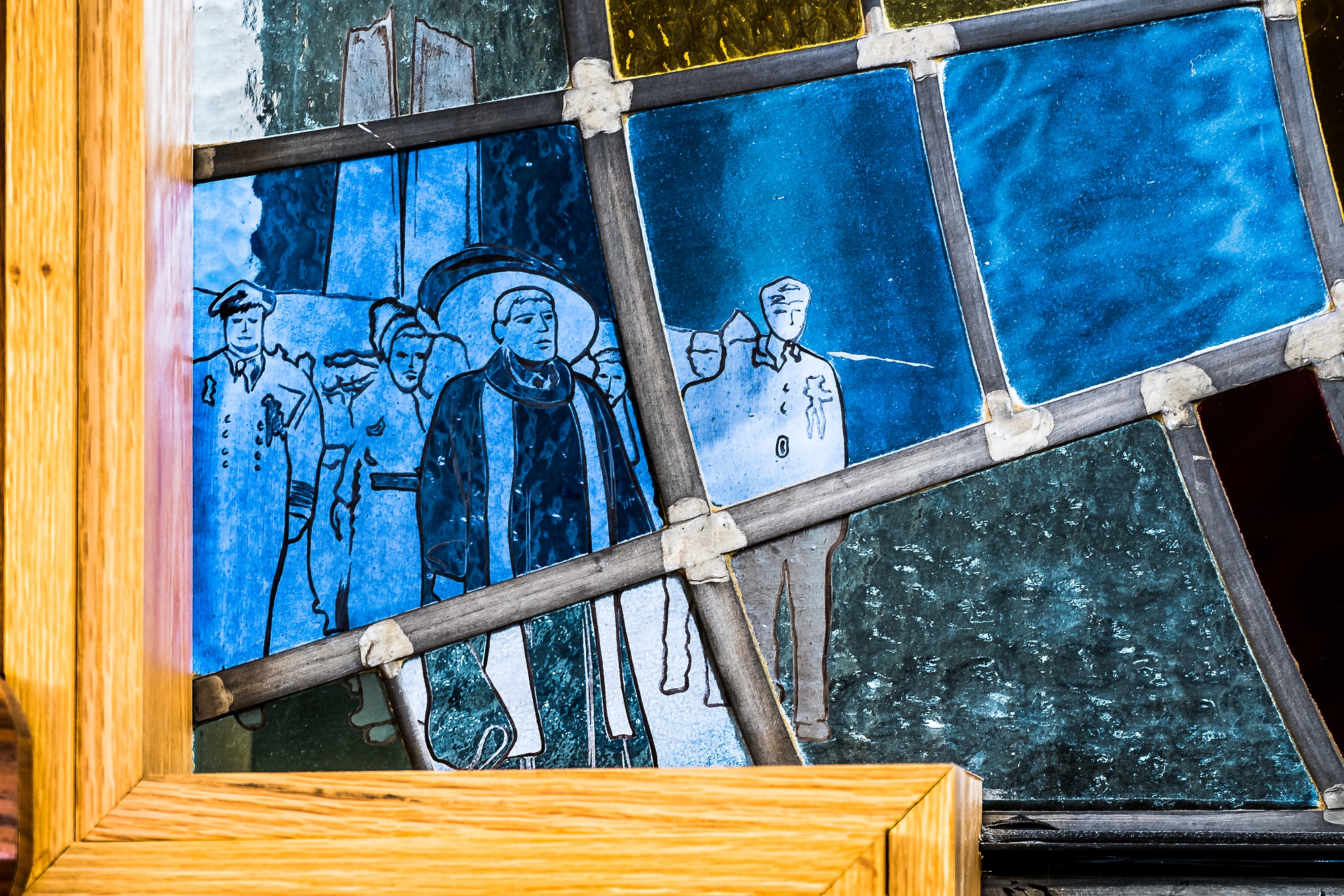 Au bas de la fenêtre se trouve Saint Martin de Tours, saint patron, qui est descendu de son cheval et donne la moitié de son manteau à un mendiant. Les épines qui les entourent symbolisent la douleur et le chagrin. Au-dessus se trouvent des images d’hommes et de femmes qui représentent les Forces canadiennes au fil des décennies.