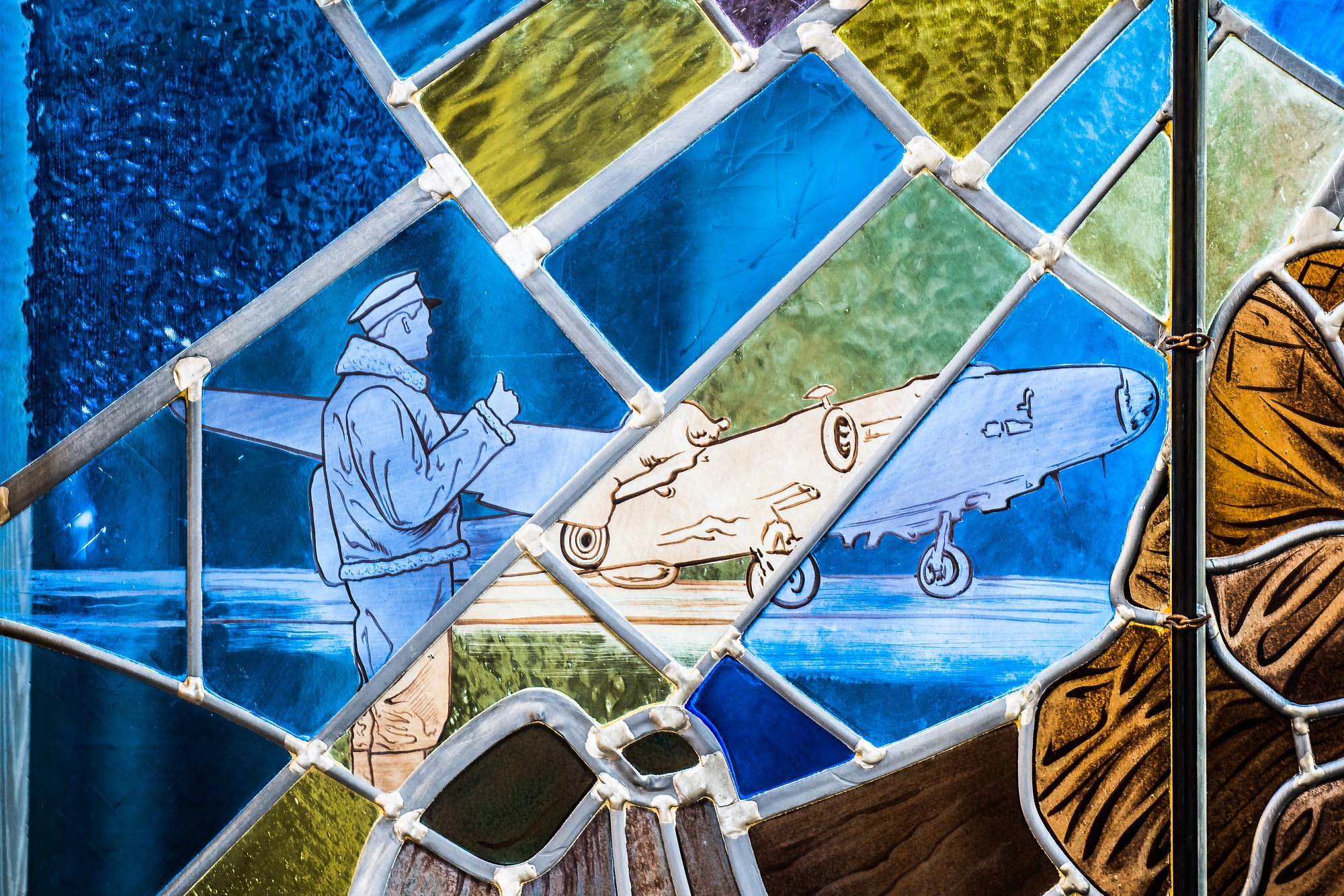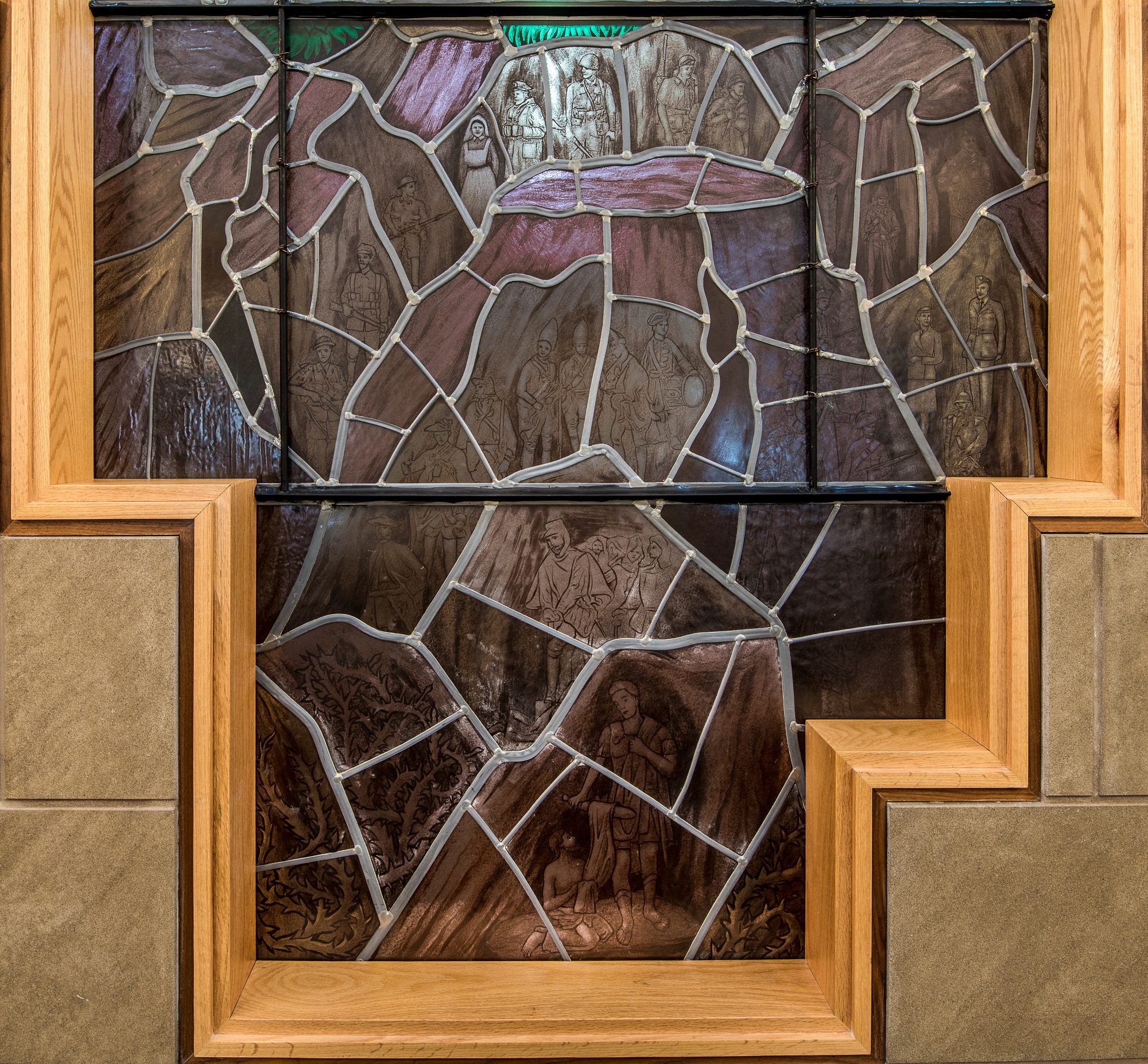 Le vitrail intitulé « Hope in a Broken World » a été donné par l’Association des Aumôniers militaires du Canada. Ce vitrail est un hommage plein de gratitude à l’égard du ministère loyal des aumôniers militaires canadiens, passés et présents. De la rugosité éternelle du rocher et de la désolation découlant des guerres et des conflits surgit un arbre de vie baigné de la lumière glorieuse de l'amour et de la compassion du Tout-Puissant. Dans ce vitrail, diverses images illustrent le ministère de ces aumôniers appelés au service de Dieu et du Canada.