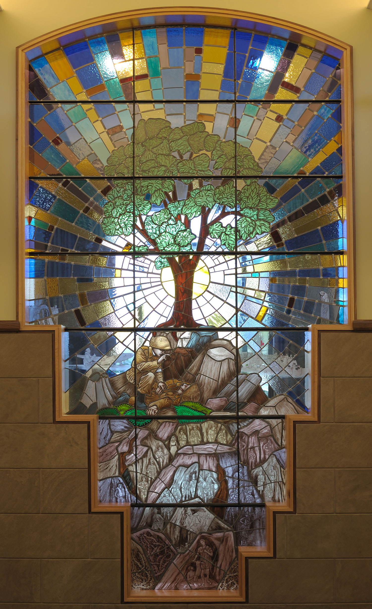 Le « rocher » est robuste et symbolise le conflit de guerre. Du rocher jaillit un arbre de vie (L'espoir dans un monde brisé), baigné dans l'amour et la lumière de la tendresse et de la miséricorde de Dieu.