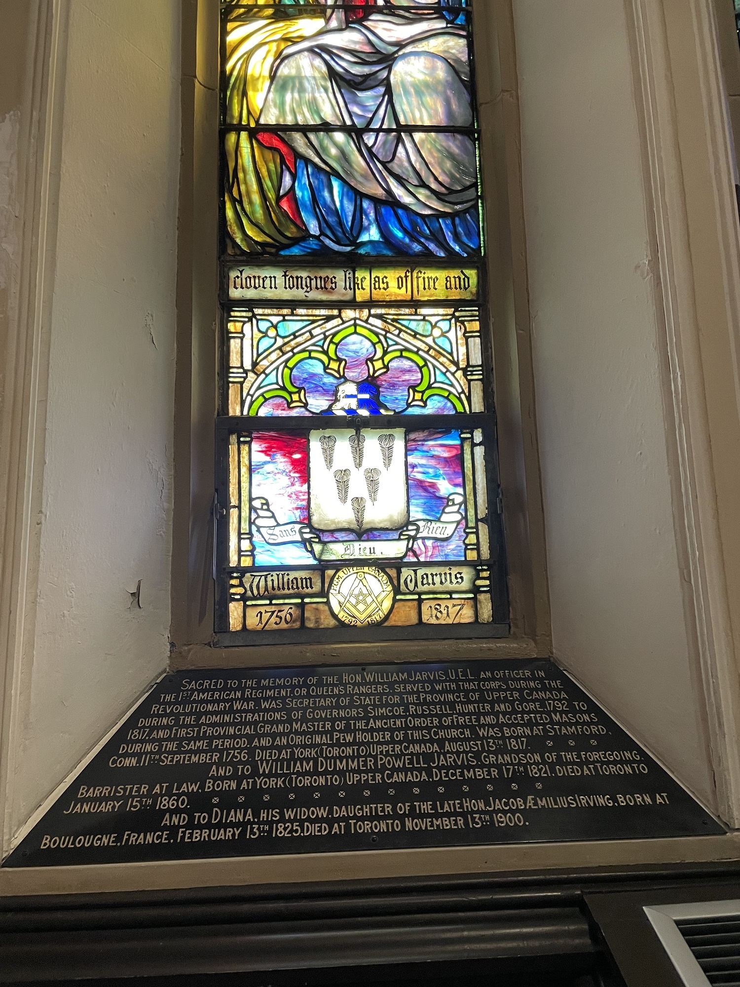 Le vitrail de Jarvis a été dédié à sa mémoire du lieutenant William Dummer Powell Jarvis après sa mort lors de la Première Guerre mondiale le 24 avril 1915. Deux ans plus tard, une plaque en son honneur a été érigée près du vitrail. Son grand?père, l’honorable William Jarvis, a servi comme officier dans le 1st American Regiment (ou Queen's Rangers) pendant la Révolution américaine.
