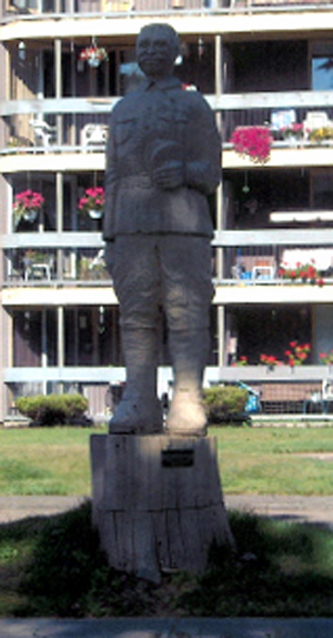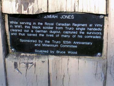 Jeremiah A. (Jerry) Jones – soldat du Royal Canadian Regiment, Première Guerre mondiale (1858-1950). Le 16 juin 1916, Jerry Jones se porte volontaire pour le service militaire. Il ment sur son âge pour être engagé et déclare avoir 39 ans, alors qu’en fait, il en a 58. À cette époque, la plupart des officiers d’état-major et de nombreux politiciens pensent que « les hommes de couleur ne font pas de bons soldats ». M. Jones leur montrera bientôt qu’ils ont tort de douter de la bravoure, du courage et du dévouement des Afro-Canadiens qui servent dans l’armée. Lors de la bataille de la crête de Vimy, au cours de laquelle les soldats canadiens se sont en général illustrés par leur courage, les efforts de Jerry Jones se détacheront nettement de ceux des autres. Pendant la bataille, les troupes canadiennes sont immobilisées par des tirs de mitrailleuse des Allemands. Le soldat Jones se porte volontaire pour réduire au silence le poste de mitrailleuse allemand; il parvient à s’approcher du nid de mitrailleuse et à jeter une grenade qui tue plusieurs soldats ennemis dans la position allemande. Les survivants se livrent ensuite au soldat Jones, qui oblige ses prisonniers à transporter leur mitrailleuse dans le champ de bataille jusqu’aux lignes canadiennes et à la déposer aux pieds de son commandant. Cet acte d’héroïsme vaut à Jerry Jones une recommandation pour la Médaille de conduite distinguée, qui reconnaît la bravoure au combat et qui représente la plus prestigieuse décoration après la Croix de Victoria. Le soldat Jones fut blessé au cours de la bataille de Vimy. Il retourne vivre à Truro où il s’éteindra en 1950. Malheureusement, en raison des préjugés de l’époque que ce soit dans l’armée, le milieu politique ou la société, M. Jones n’a jamais obtenu la Médaille de conduite distinguée pour laquelle il avait été recommandé et qu’il méritait à juste titre. La statue a été sculptée dans un tronc d’arbre par Bruce Wood.