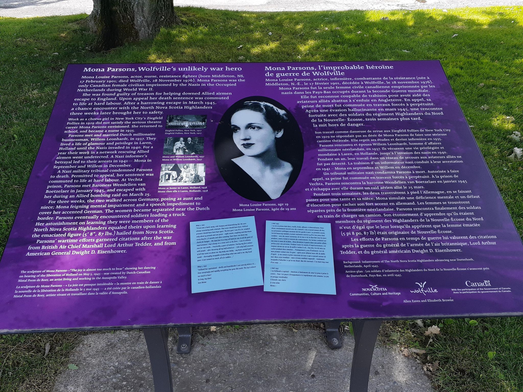Mona Louise Parsons, acrtice, infirmière, combattante de la résistance (née à Middleton, N.-É., 17 février 1901, décédé à Wolfville, le 28 novembre 1976). Mona Parsons fut la seule femme civile canadienne emprisonnée par les nazis dans les Pays-Bas occupés durant la Seconde Guerre mondiale.