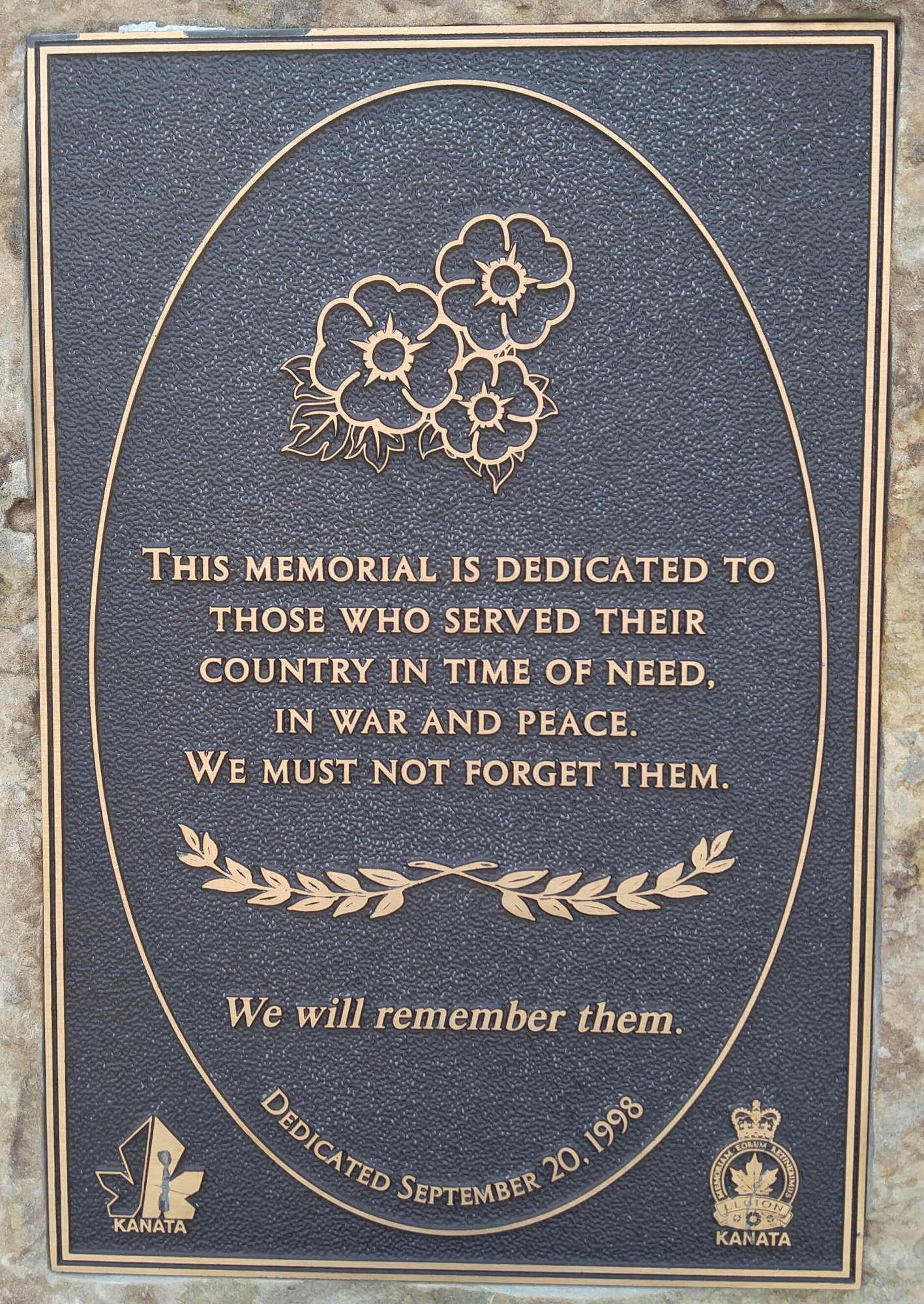 La Ville de Kanata a inauguré son propre cénotaphe le 20 septembre 1998, afin de donner à ses habitants un lieu pour se rassembler, se recueillir, prier ou simplement trouver quelques instants de calme pour se rappeler ceux qui ont donné leur vie afin que nous puissions vivre dans la paix et la liberté. Des représentants des administrations locale et régionale, du gouvernement national et des forces armées, ainsi que des invités du grand public ont assisté à l’inauguration. Cette cérémonie touchante, qui s’est déroulée avec une précision toute militaire, a été marquée notamment par le survol de deux hélicoptères militaires pendant l’exécution de la sonnerie aux morts. Après l’inauguration, une réception offerte par les Dames auxiliaires a eu lieu à la salle de la Légion.
