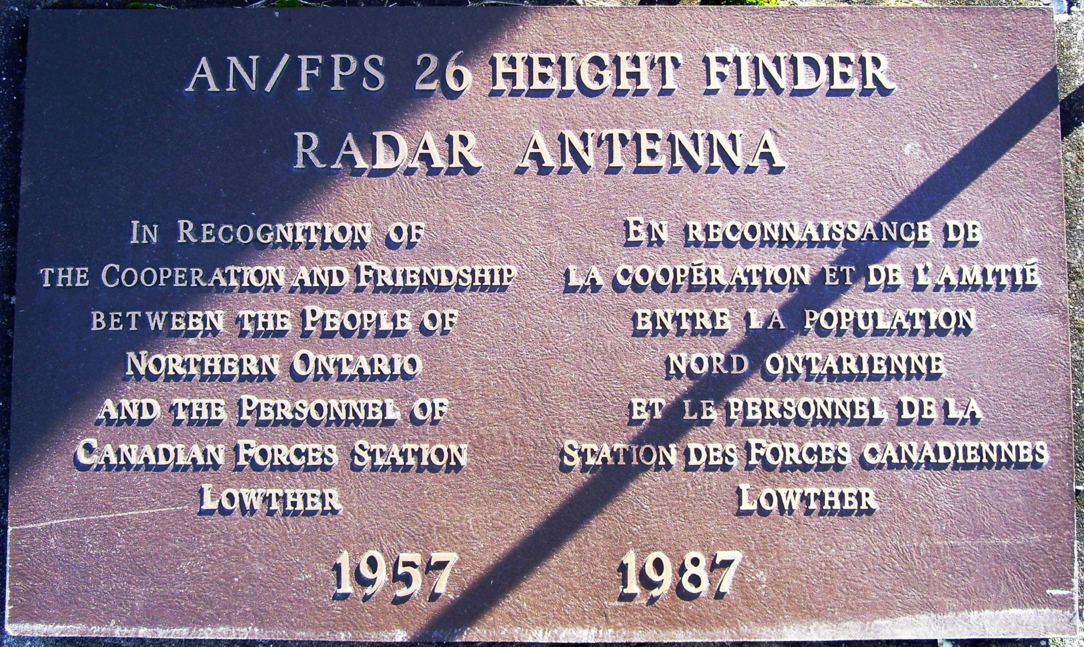 Ce mémorial, une antenne de radar altimètre, est un don de la Station des Forces canadiennes de Lowther.