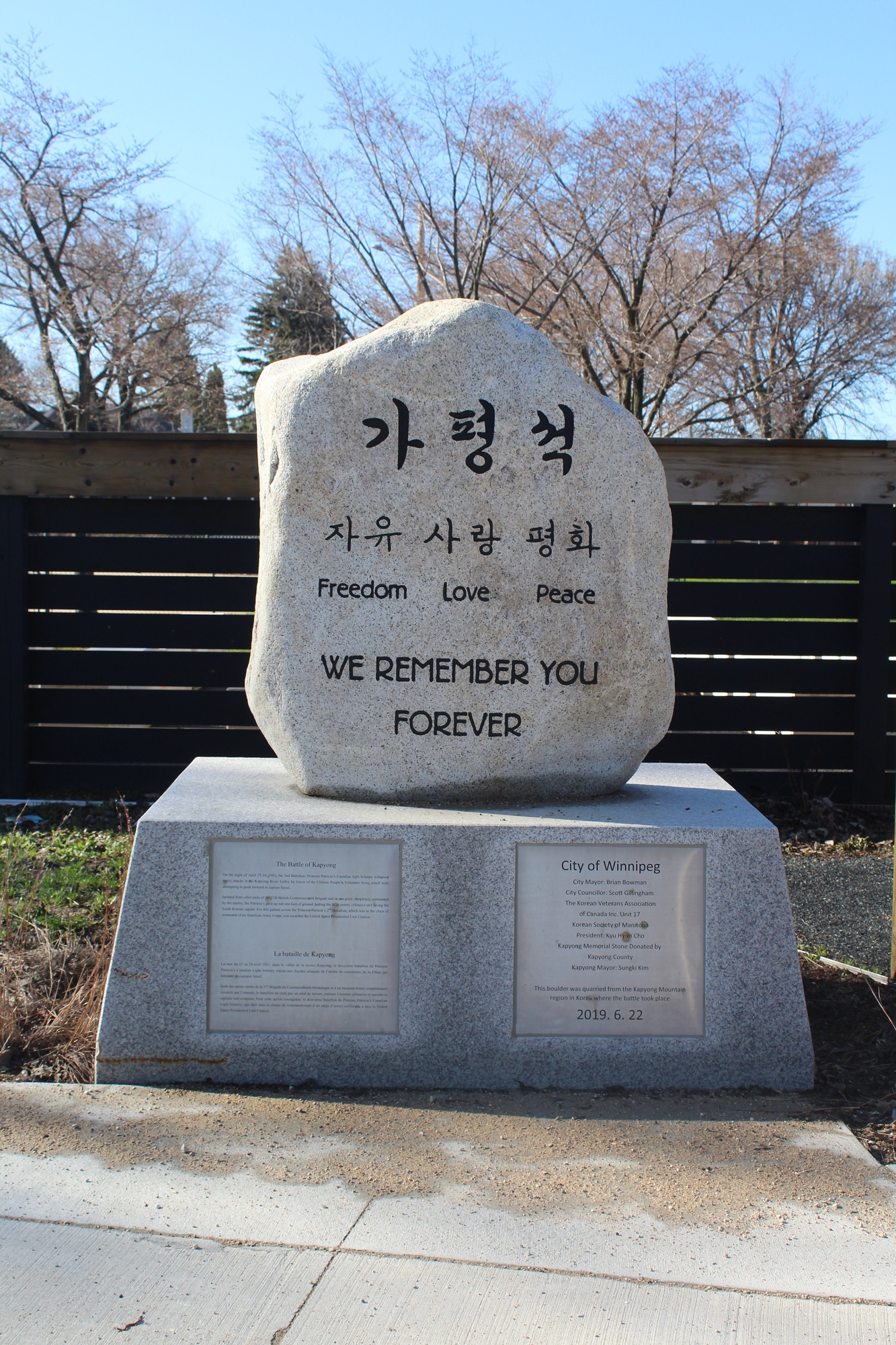 Le gouvernement de la Corée du Sud a fait don d’un grand bloc de granit de la région de Kapyong, que l’on peut voir à l’entrée du parc Kapyong.