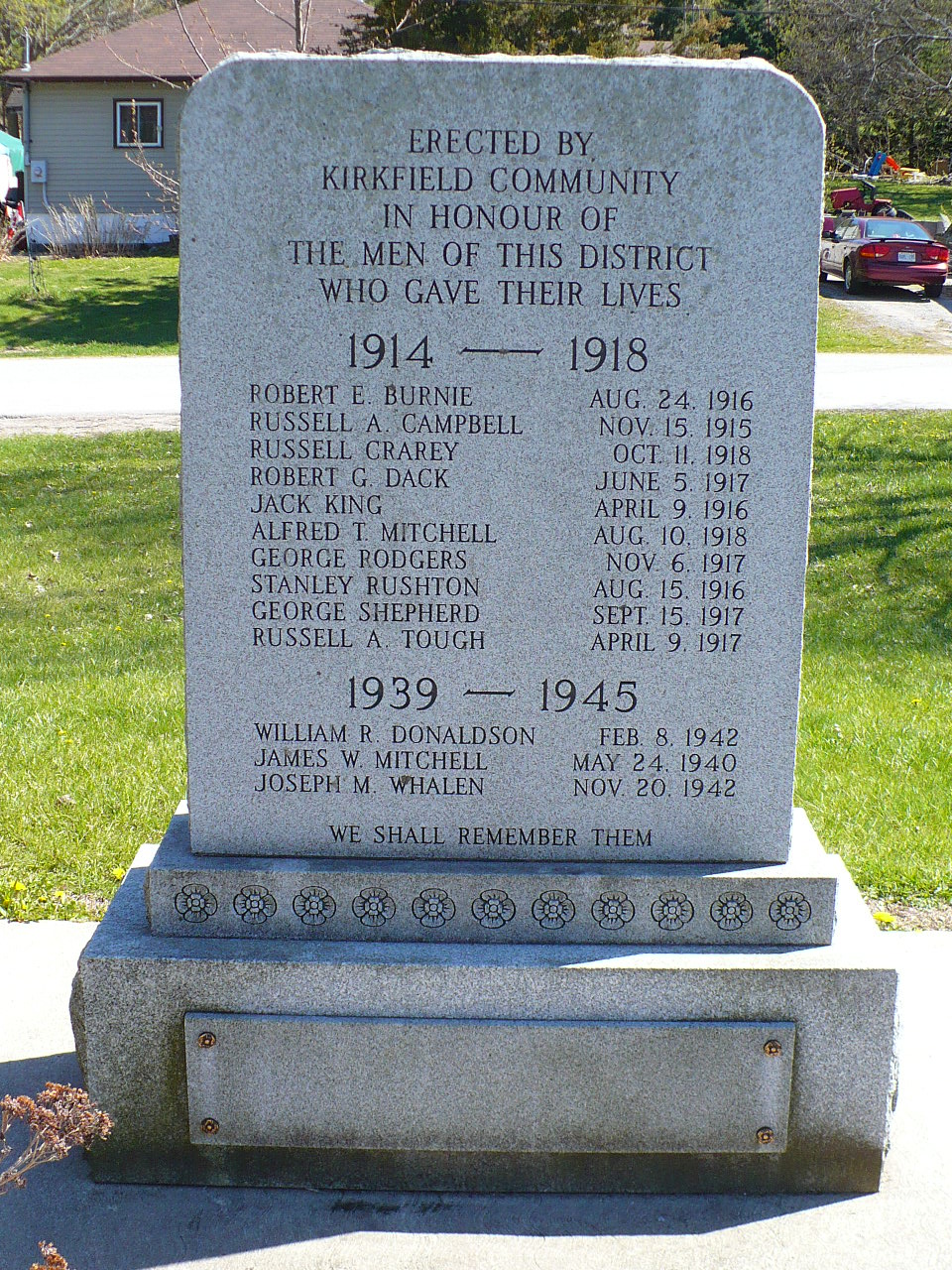 Érigé par la communauté de Kirkfield en juin 2000, ce mémorial est dédié à ceux qui sont morts durant les Première et Seconde Guerres mondiales.