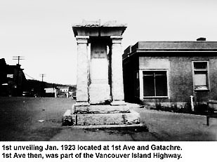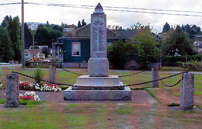 Sur le cénotaphe sont inscrits les noms de 41 soldats de la Première Guerre mondiale ayant un lien avec Ladysmith (étant nés, ayant vécu ou ayant travaillé à Ladysmith et dans le district). La liste a été dressée par le Ladysmith Chronicle et l’hôtel de ville à l’automne 1922. Les gens ont été invités à soumettre les noms des personnes qui, selon eux, devraient figurer sur le cénotaphe. Les soldats inscrits proviennent de la ville de Ladysmith de l’époque et du district environnant, qui comprenait le district original d’Oyster, Saltair et Blaineys Crossing au sud de Ladysmith, ainsi que Brentons Crossing, North Oyster, Yellow Point, une partie de Cedar, Cassidy, South Wellington et le prolongement au nord de Ladysmith. Certains des soldats décédés des régions situées au nord de Ladysmith étaient bien connus à Nanaimo, ainsi qu’à Ladysmith, et leurs noms figurent sur les deux cénotaphes. Le cénotaphe original, inauguré au début de l’année 1923, comportait 40 noms. Le nom de Thomas Day a été ajouté plus tard, ainsi que les dates de la guerre de Corée.
