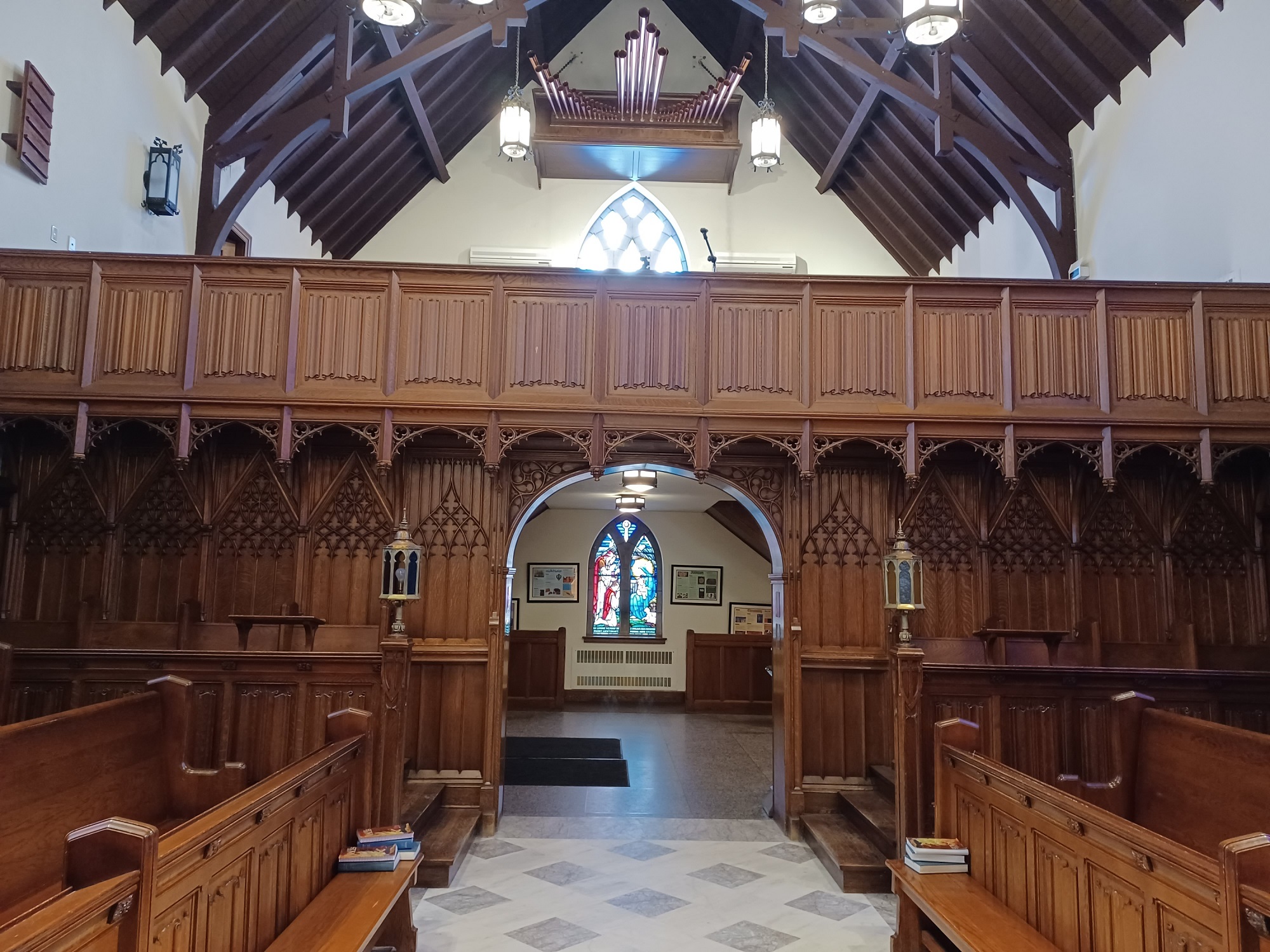 Le paravent et les stalles du caporal suppléant Aubrey de Vere Arnold Turquand ont été offerts par sa mère à la mémoire de son fils tombé au combat pendant la Première Guerre mondiale.