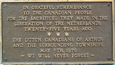 Liberation of the Netherlands Plaque was erected on May 5, 1970, by the Dutch Canadians of Arthur and surrounding townships.