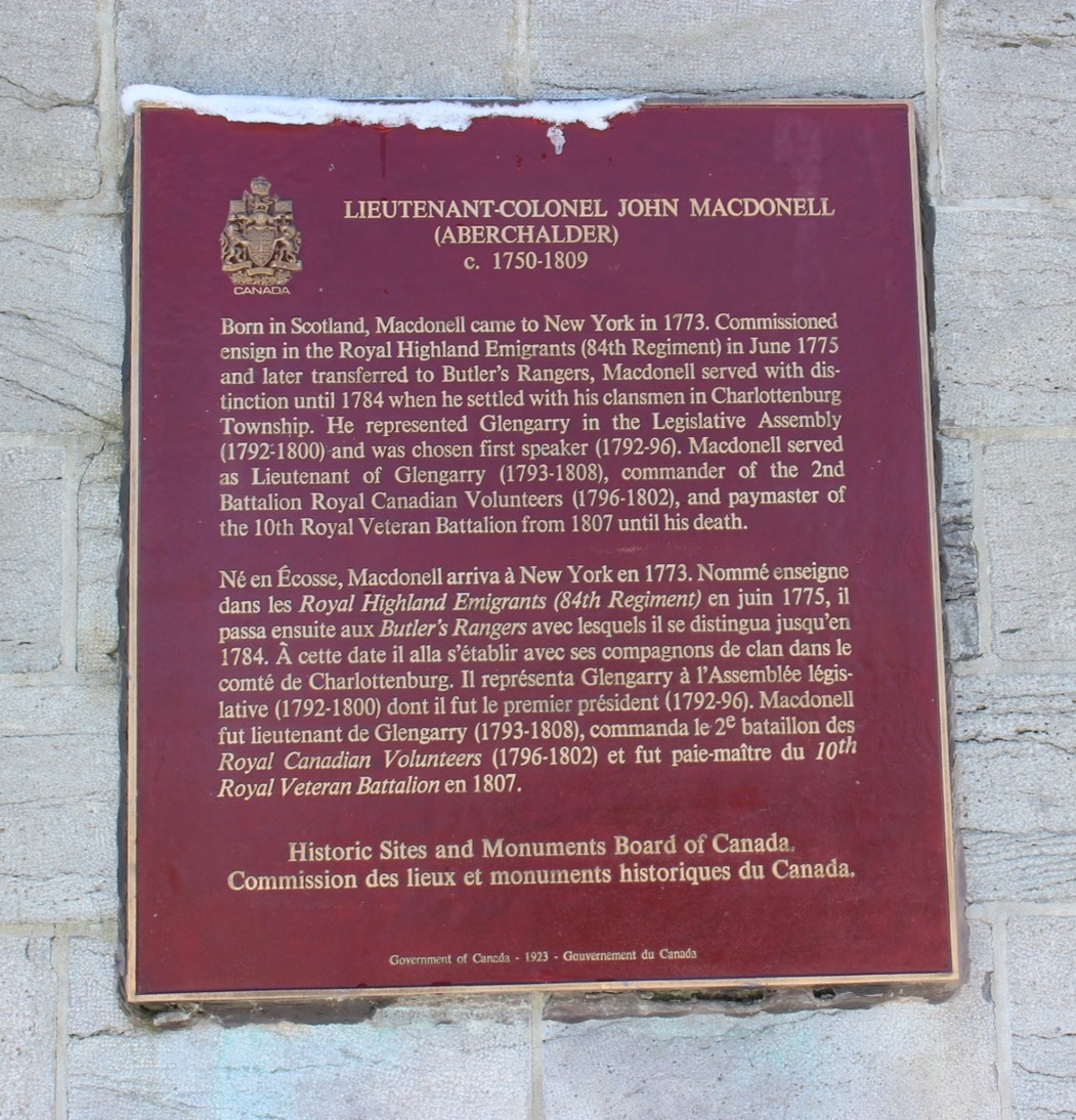Born in Scotland, Macdonell came to New York in 1773. Commissioned ensign in the Royal Highland Emigrants (84th Regiment) in June 1775 and later transferred to Butler’s Rangers, Macdonell served with distinction until 1784 when he settled with his clansmen in Charlottenburg Township. He represented Glengarry in the Legislative Assembly (1792 – 1800) and was chosen first speaker (1792 – 1796). Macdonell served as Lieutenant of Glengarry (1793 – 1808), commander of the 2nd Battalion Royal Canadian Volunteers (1796 – 1802), and paymaster of the 10th Royal Veteran Battalion from 1807 until his death.