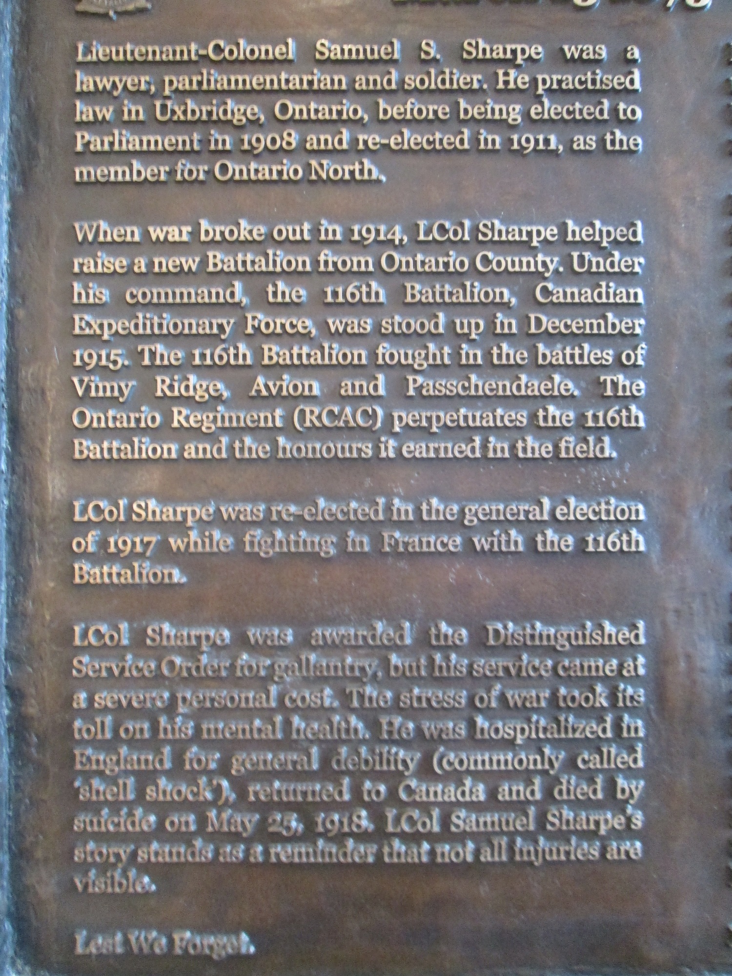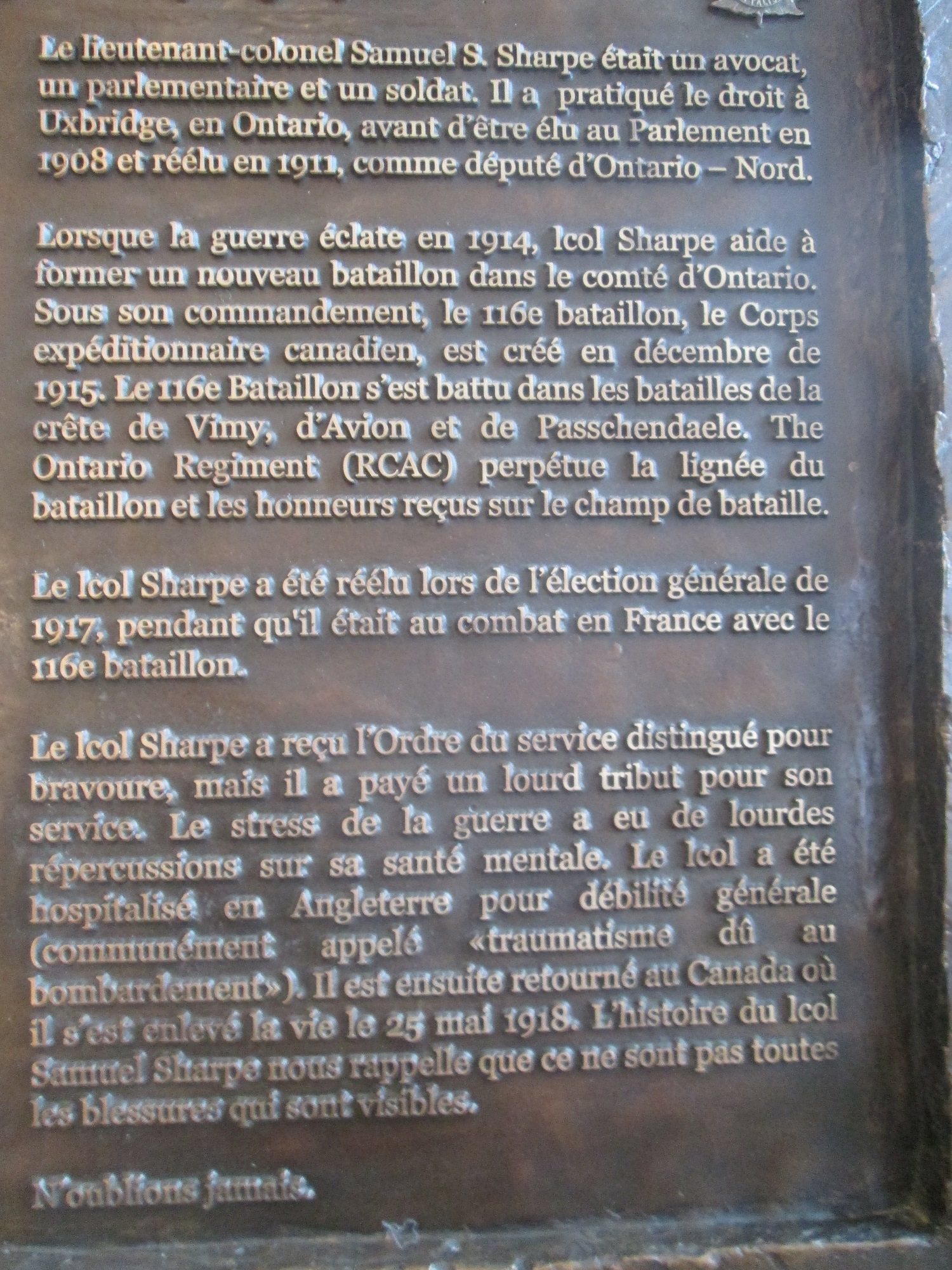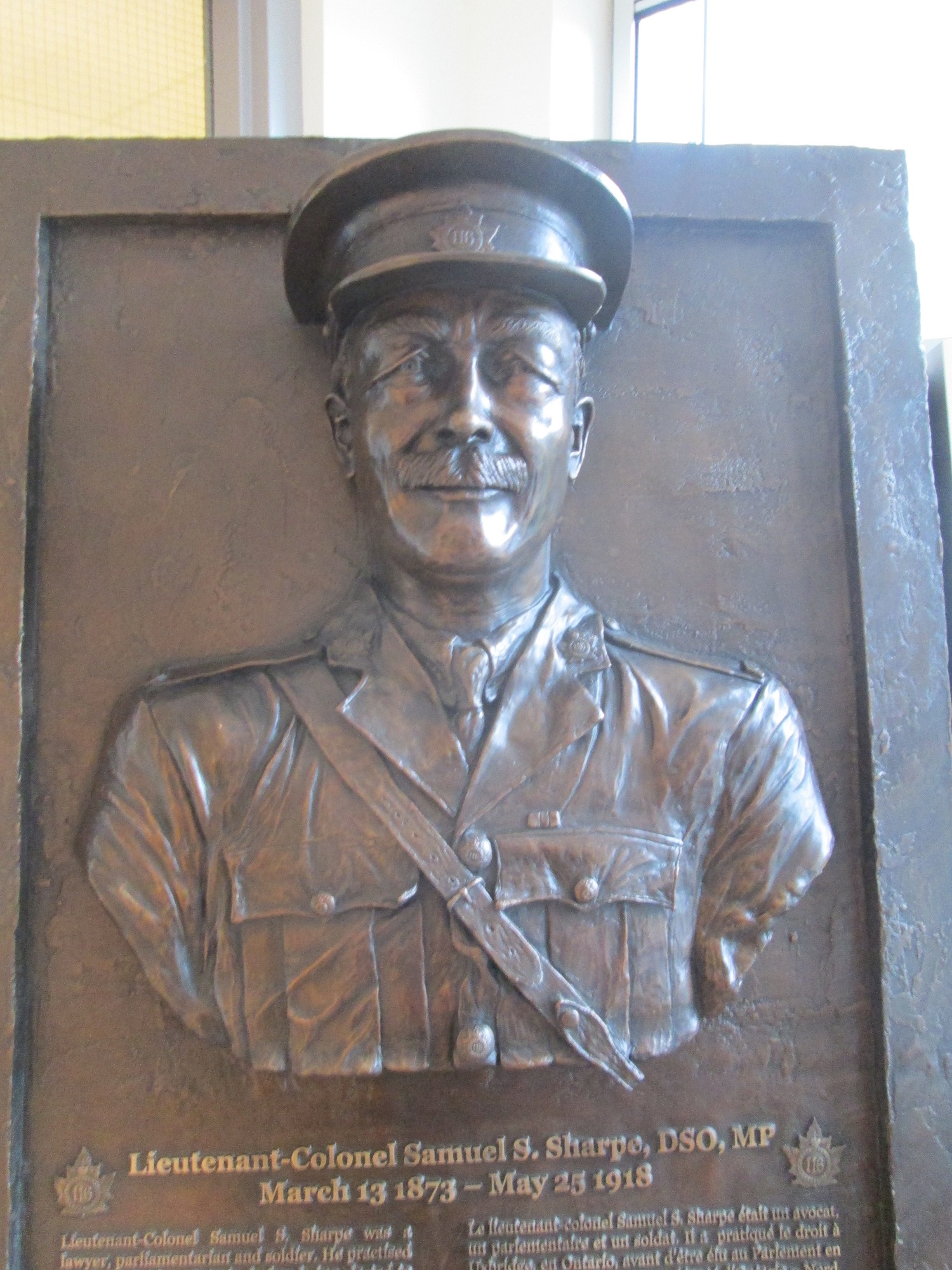 Le relief du lieutenant-colonel Sam Sharpe a été conçue par l’artiste Tyler Brindley en mémoire du service du lieutenant-colonel pendant la Première Guerre mondiale. Le lieutenant-colonel Sharpe a été élu à la Chambre des communes pour la première fois en 1908, et réélu en 1911 dans la circonscription d'Ontario Nord. Il était député lorsque la Première Guerre mondiale a éclaté, et a aidé à mobiliser le 116e Bataillon du Corps expéditionnaire canadien. Il a commandé le Bataillon en Europe, et a été réélu en décembre 1917, alors qu'il combattait en France. Le lcol Sharpe et son unité étaient présents lors de l'assaut de la crête de Vimy, et ils ont combattu à Avion et à Passchendaele. Après avoir subi des blessures psychologiques au front, il a été hospitalisé en Angleterre, avant de revenir au Canada. Le lieutenant-colonel Sharpe s'est enlevé la vie le 25 mai 1918, quand il a sauté d’une fenêtre de l’hôpital Royal Victoria à Montréal.