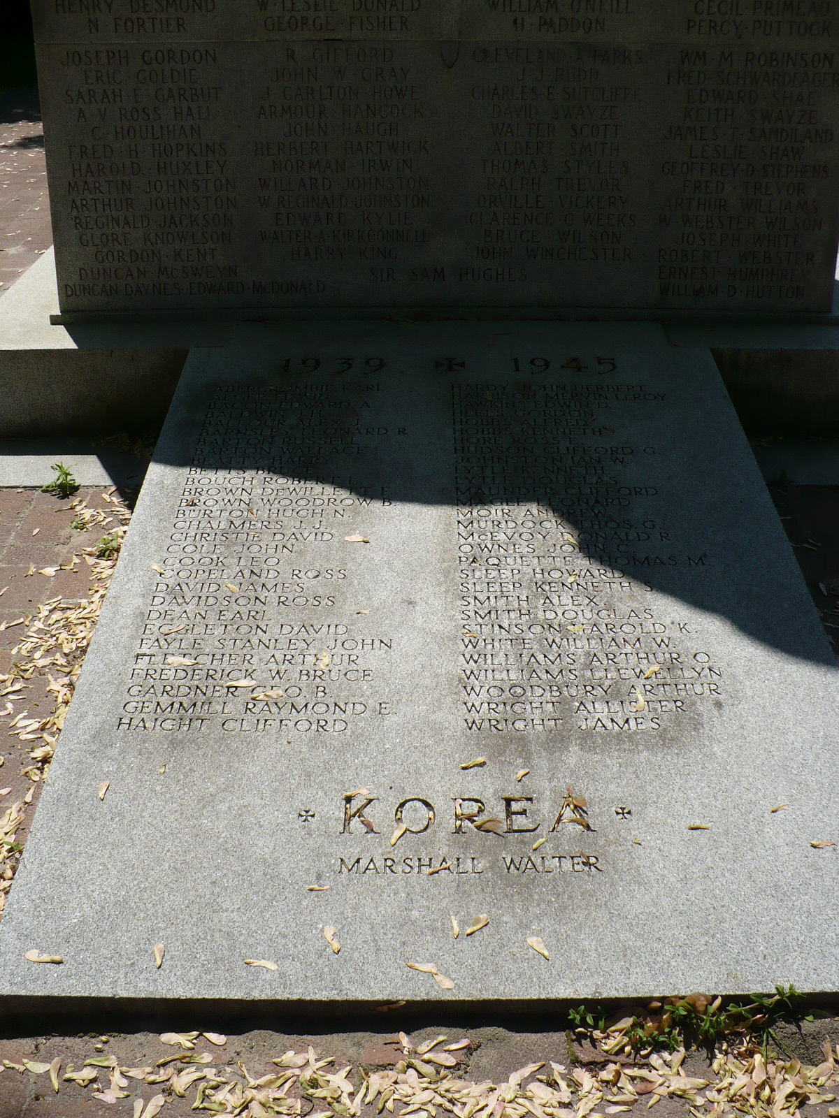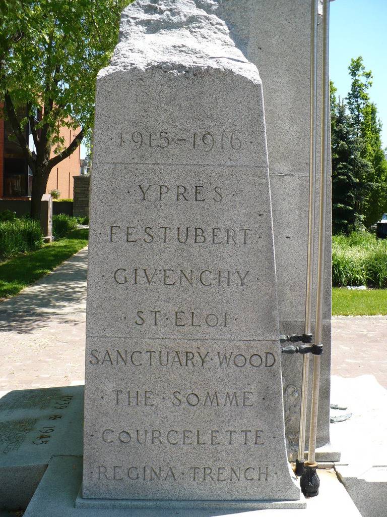 En 1921, des plans initiaux étaient en cours en vue de l’aménagement d’un monument commémoratif de guerre. En mars, la Chambre de commerce a convoqué une réunion à laquelle étaient invités tous les habitants de la localité qui avaient perdu des proches pendant la Grande Guerre. Il a été décidé de recueillir 7 500 dollars au moyen d’obligations et de recueillir le reste du montant au moyen de dons publics. En avril 1922, le comité du monument commémoratif de guerre a décidé que le monument serait aménagé sur le terrain de la bibliothèque. Après la Seconde Guerre mondiale, une dalle a été ajoutée au niveau du sol sur laquelle sont inscrits les noms de ceux qui ont perdu la vie dans cette guerre. Un dernier nom a été ajouté après la guerre de Corée.