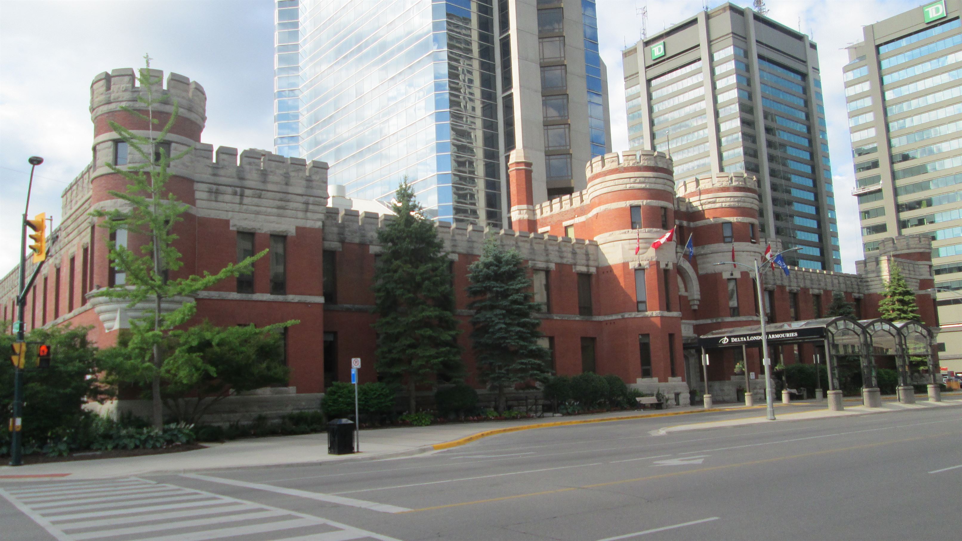 Après quelques années, cette installation est devenue inadéquate et un nouveau manège militaire a été construit à l’angle des rues Dundas et Waterloo. Inauguré en grande pompe le 1er février 1905, le manège militaire a dès lors abrité de nombreuses unités de la milice, y compris les 1st Hussars, les unités de l’Artillerie royale canadienne et du Corps du génie royal canadien, le Royal Canadian Regiment, le Corps royal de l’intendance de l’Armée canadienne et le Corps de santé royal canadien. Le manège militaire a malheureusement été fermé et le drapeau canadien a été mis en berne pour la dernière fois le 4 juin 1978, marquant ainsi sa fermeture officielle. Le bâtiment est resté vide pendant des années et sa démolition semblait imminente. Cependant, en 1988, un promoteur immobilier a converti le bâtiment en hôtel de luxe. Il a conservé les murs extérieurs et construit une tour de vingt étages au centre. L’hôtel Delta London Armouries est aujourd’hui l’un des lieux d’hébergement les plus prisés de la ville.