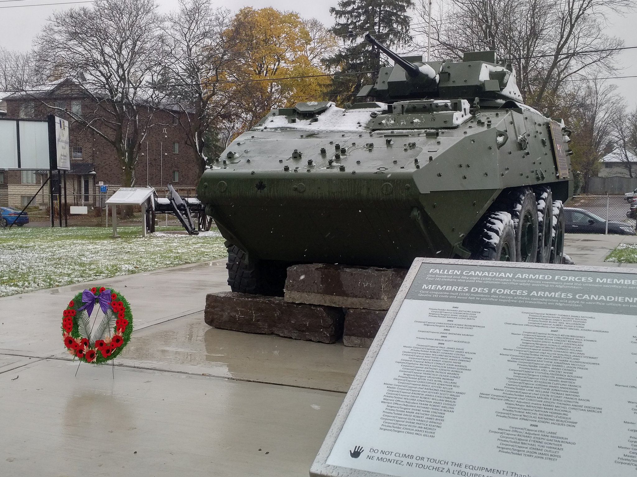 Des dignitaires de la Ville de London, des représentants du 31e Groupe?brigade du Canada, du ministère de la Défense nationale, du Musée du Royal Canadian Regiment, de la Compagnie Canada et du London Heritage Council se sont réunis le 9 novembre 2018 pour dévoiler un monument constitué d’un VBL III pour rendre hommage aux membres des Forces armées canadiennes (FAC) qui ont servi et qui se sont sacrifiés en Afghanistan, entre 2001 et 2014.