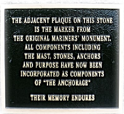 Cette plaque désignait le monument des premiers marins, dont les parties ont été incorporées au nouveau monument commémoratif de l’Anchorage. Ce mémorial fait partie des vestiges de l’Anchorage.