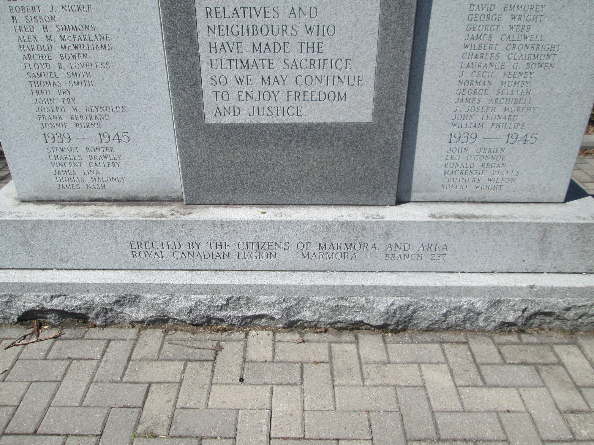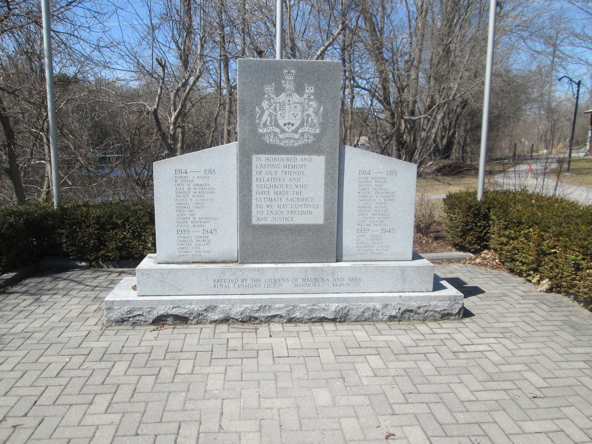 This cenotaph honours the citizens of the Marmora area who gave their lives serving in the First and Second World Wars.
