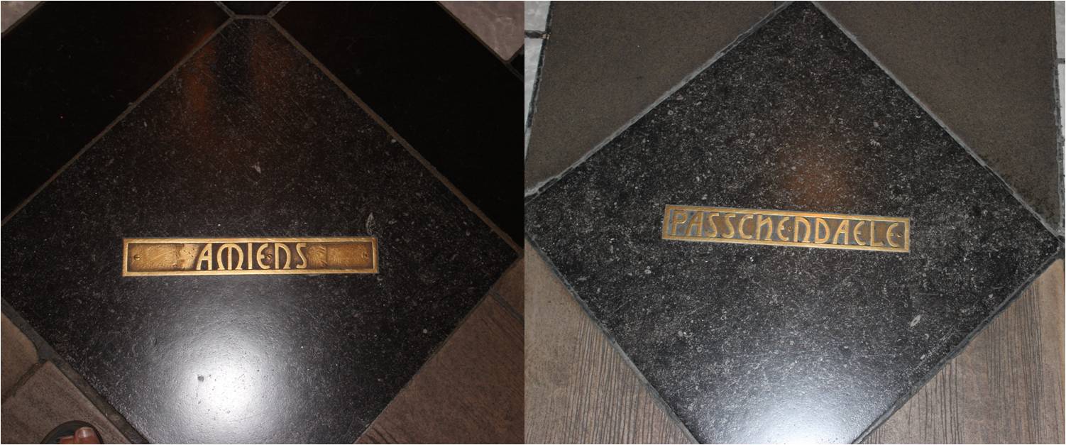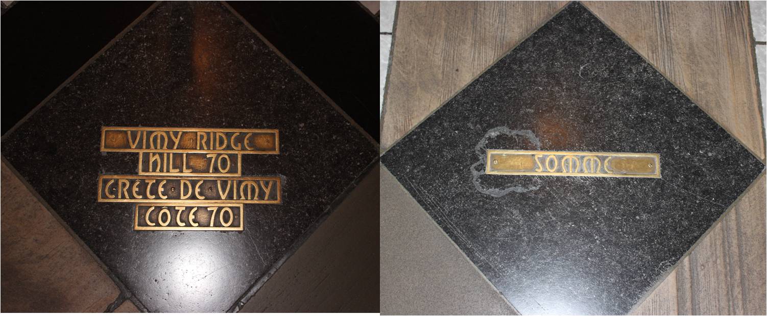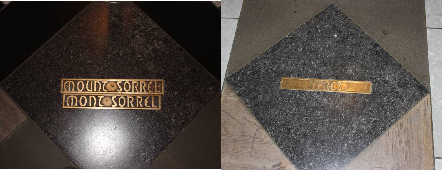 Les dalles utilisées dans la Chapelle du Souvenir ont été sélectionnées dans divers champs de bataille en France et en Belgique par le personnel d’état-major de la Défense du Canada affecté à Poperinghe, en Flandres. Les noms des principales batailles auxquelles les forces canadiennes ont participé ont été gravés sur huit plaques de laiton. Ce sont : Ypres, Mont Sorrel, la Somme, Crête de Vimy, Côte 70, Passchendaele, Amiens, Arras, Cambrai, Valenciennes et Mons.