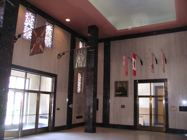 Memorial Hall was erected in recognition of the important contribution made by members of the McGill community in the service of their country. Dedicated on October 6, 1946, the Memorial Hall and adjoining Memorial Pool were the most substantial gestures of remembrance on the McGill University campus. The project was approved by the Board of Governors on October 23, 1944. Four years after the end of the Second World War, the Sir Arthur Currie Memorial Gymnasium-Armoury building was expanded to include Memorial Hall. With its marble and terrazzo finishes, bronze doors, stained glass windows, and commemorative artwork and plaques, the Hall became the central point of the McGill community’s collective memory of the World Wars.