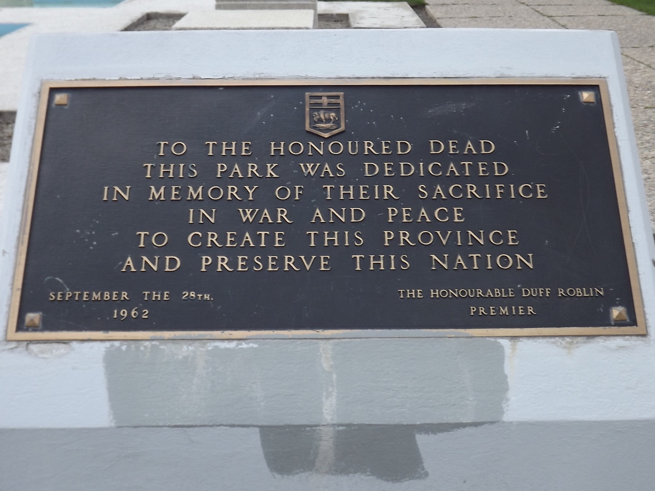 En 1961, la Province, qui possédait déjà une parcelle de terrain adjacente, a acheté le site à la Ville. L’ancien premier ministre Duff Roblin voyait le parc provincial Memorial comme un juste hommage à ceux qui ont donné leur vie pour la liberté. Le parc provincial, y compris la fontaine City Hydro, est reconnu comme un monument commémoratif militaire canadien. Le parc Memorial a été inauguré le 28 septembre 1962 par le lieutenant-gouverneur Errick Willis et le premier ministre Duff Roblin.