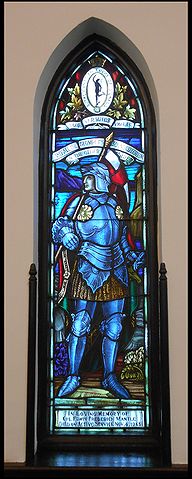 A stained glass memorial window was erected in honour of Corporal Edwin Frederick Mantle at New Horizons Baptist Church featuring the Royal Canadian Corps of Signals crest at the top, a knight in armour with a dedication below. The inscription above on the banner "And all the trumpets sound for him on the other side" is taken from The Pilgrim's Progress by John Bunyan. He was the son of Albert Frederick and Charlotte Alice Mantle, of London, Ontario, Canada. He died on active service at 38 and was buried in Port Glasgow Cemetery in Renfrewshire, United Kingdom Grave Reference: Sec. M. Row 2. Grave 50.