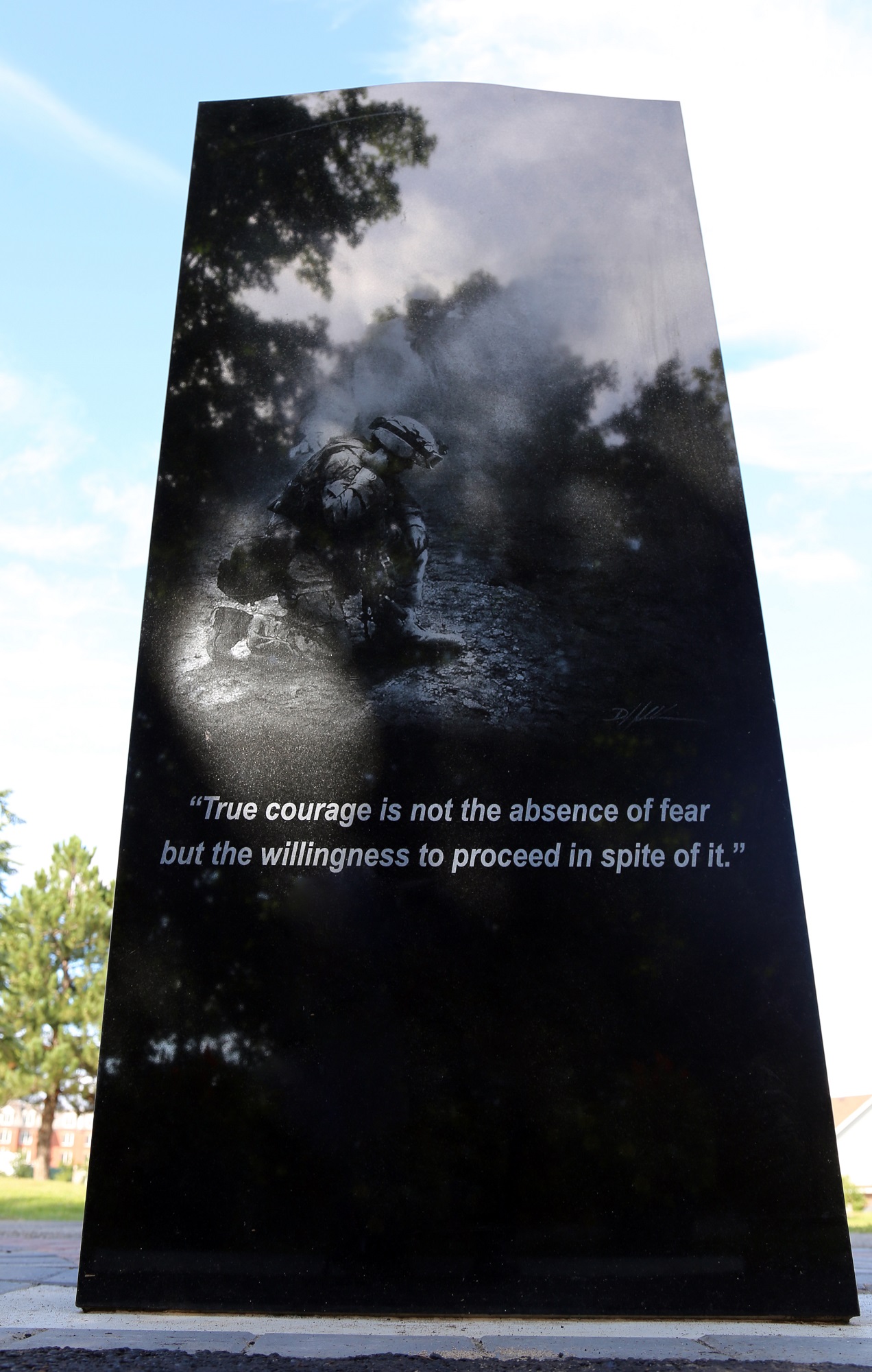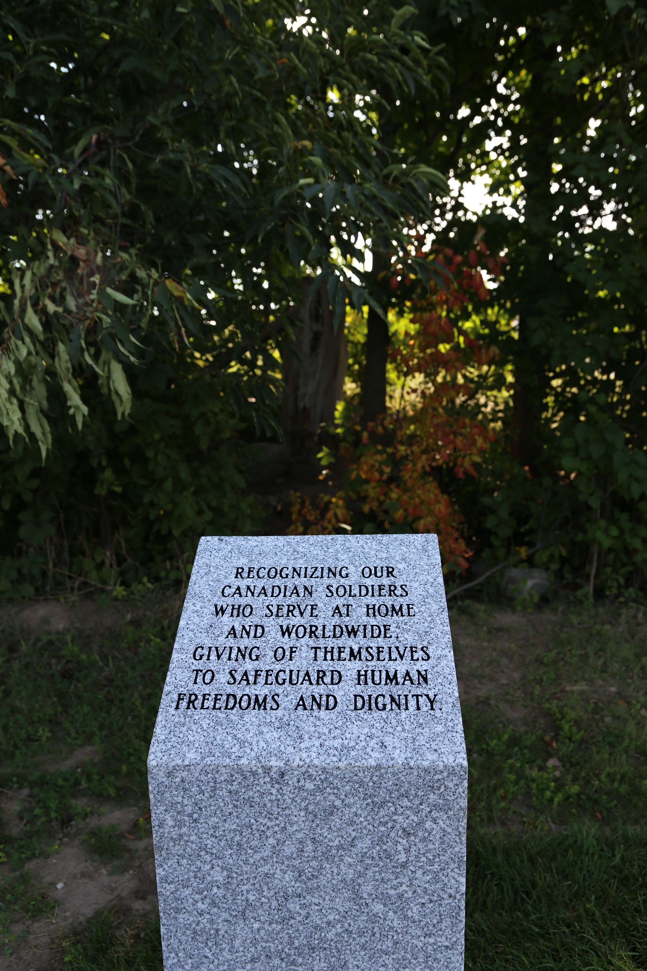 Elle reconnaît les multiples sacrifices consentis sur le champ de bataille et ailleurs et rend hommage à la bravoure des Forces armées canadiennes. Le logo de la Canadian Heroes Foundation orne le devant de la pierre. La fondation s’efforce de sensibiliser les gens aux premiers répondants, à nos héros décédés et à leur famille, et de les soutenir. Sous le logo est gravé un hommage au courage et à l’altruisme de ceux qui servent notre pays – d’hier, d’aujourd’hui et de demain.