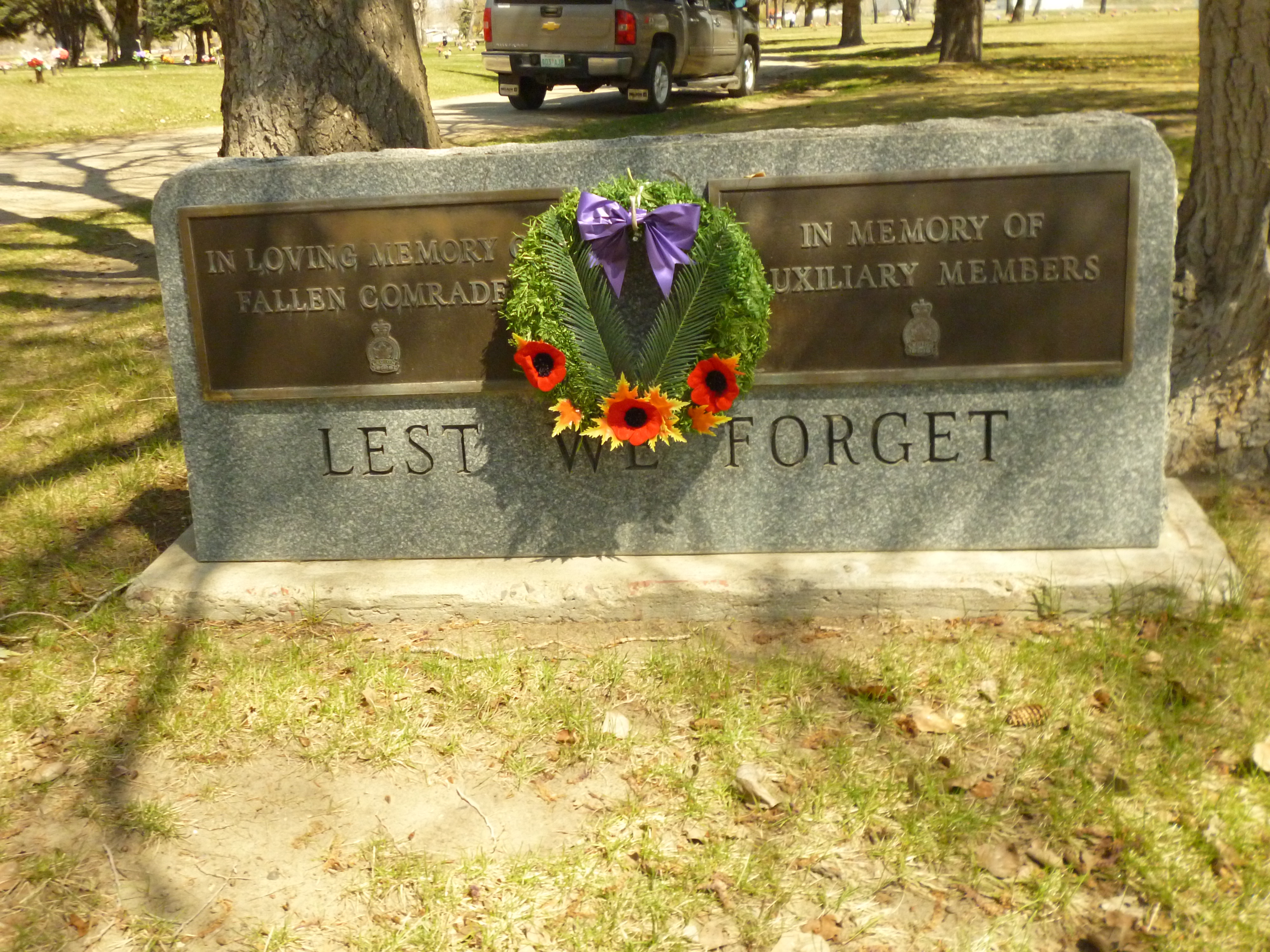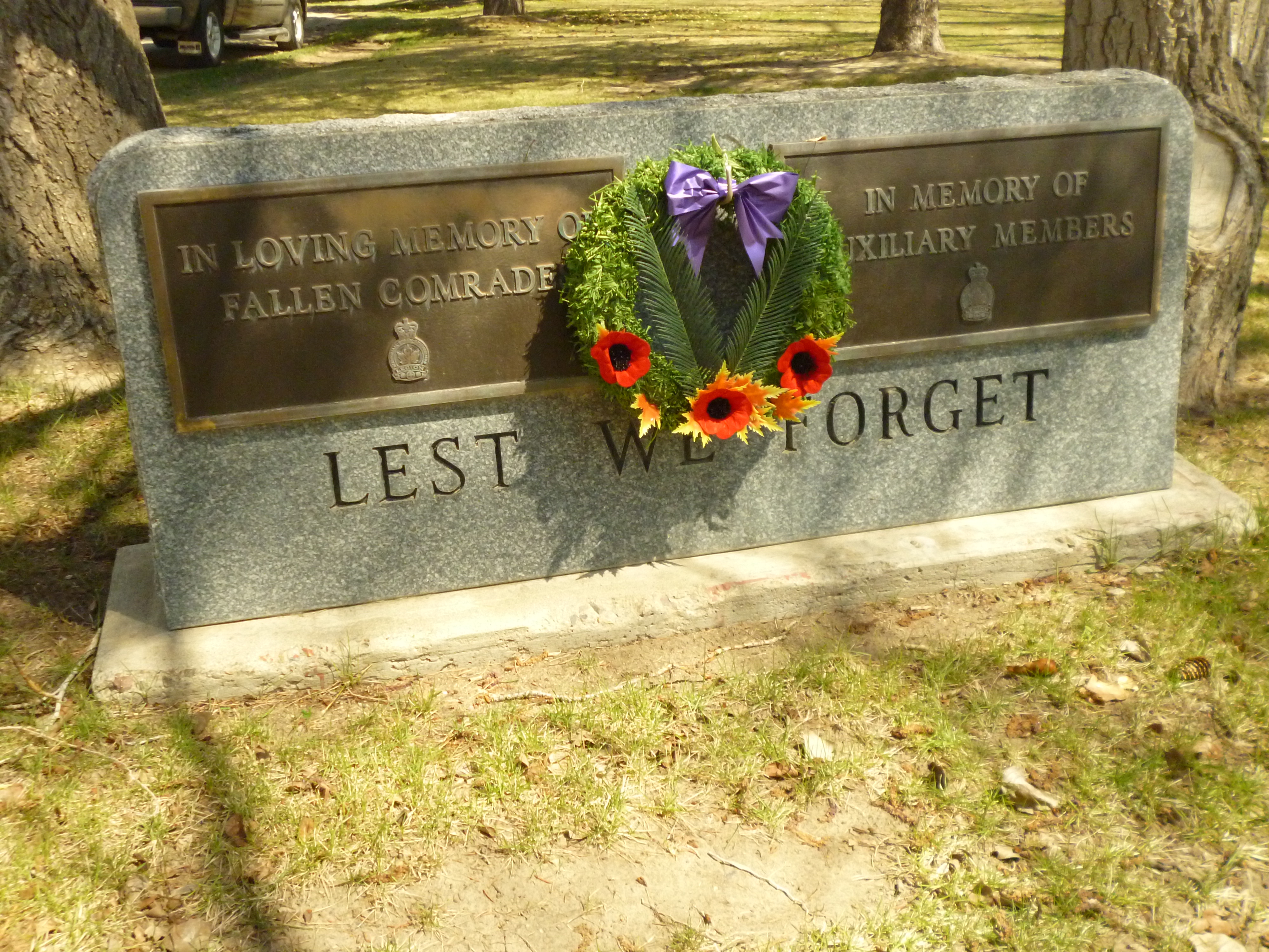 Monument de granite érigé au cimetière Memory Gardens à Swift Current en août 2005. La filiale no 56 de la Légion royale canadienne (de Swift Current) exprime toute sa reconnaissance à l’égard de Bud Cates de Swift Current Monumental Co. Ltd., qui a fait don du granite, a gravé le monument et l’a installé. Les plaques sont les mêmes que celles qui se trouvaient sur l’ancien monument de contreplaqué qui avait été érigé au même endroit et qui a dû être remplacé en raison de sa détérioration.