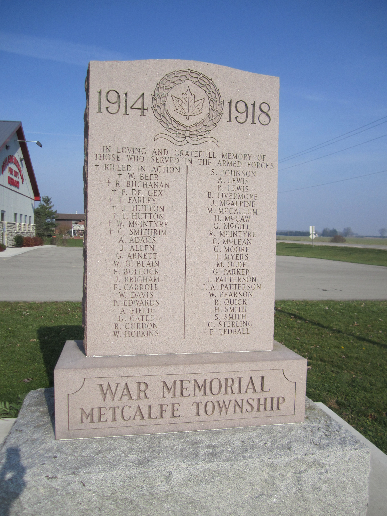 Le monument commémoratif de guerre du canton de Metcalfe était à l’origine situé à la Metcalfe Central School, au 6101, promenade Calvert. Lorsque l’école a été fermée en 2010, le canton a déplacé le monument à Kerwood.