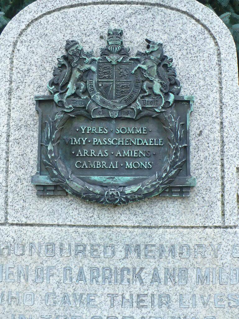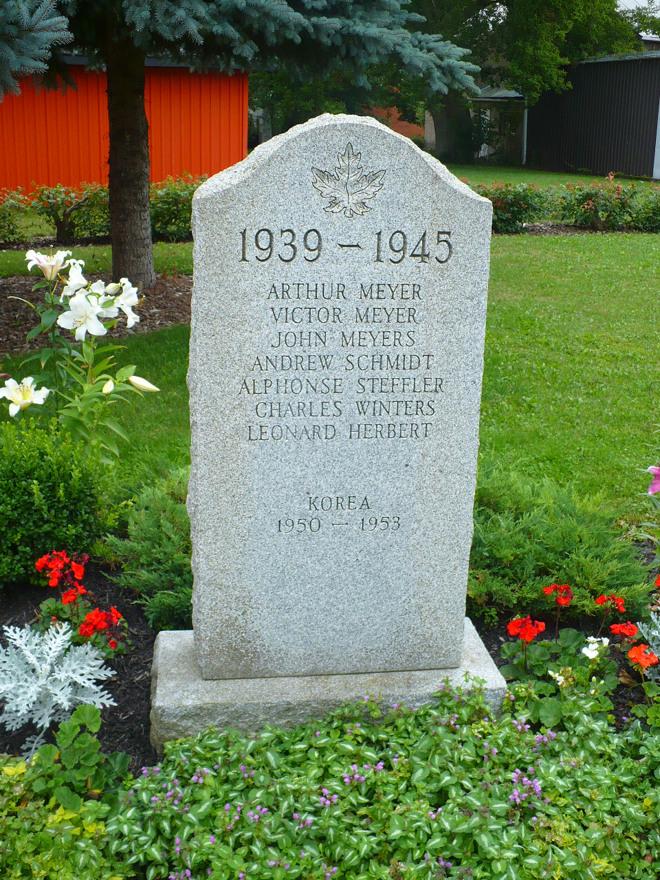 Le terrain sur lequel s’élèvent aujourd’hui les monuments aux morts de Mildmay-Carrick a été acheté de Mme John F. Schuett par la Bruce Preparedness League, dont le président était M. Joe Thompson, de Clifford. Cet achat a eu lieu peu après la Première Guerre mondiale, et c’est à ce moment-là qu’a été érigé le monument central actuel. En 1951, d’importantes rénovations ont été réalisées sur le terrain, et les deux pierres plus petites ont été mises en place à la mémoire des hommes qui ont sacrifié leur vie pendant la Seconde Guerre mondiale. C’est à ce moment-là que le trottoir circulaire en ciment a été construit, que la fontaine a été installée, que les arbustes et les buissons ont été plantés et que la clôture qui encercle encore le terrain a été construite. Résolution du conseil de Carrick au sujet du cénotaphe, le 24 mars 1919 : « Que le conseil accorde une subvention de six cent dollars en vue de l’érection d’un monument aux morts à Mildmay, et que MM. Montag, Lewis et Schnurr se chargent du choix et de la construction dudit monument en collaboration avec un comité du conseil de village et de la Preparedness League. »