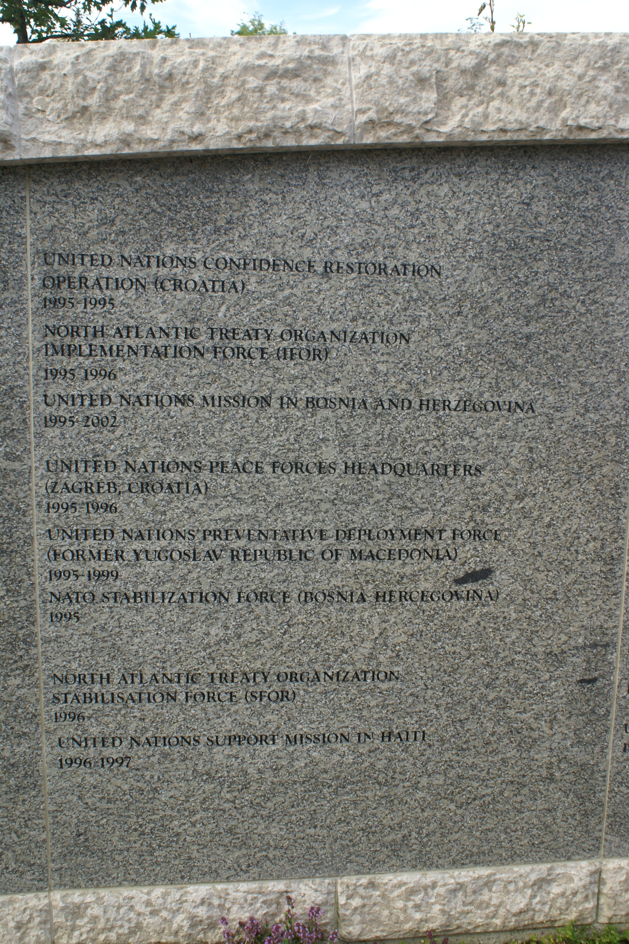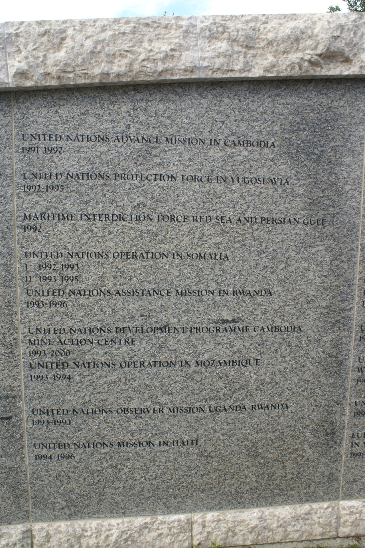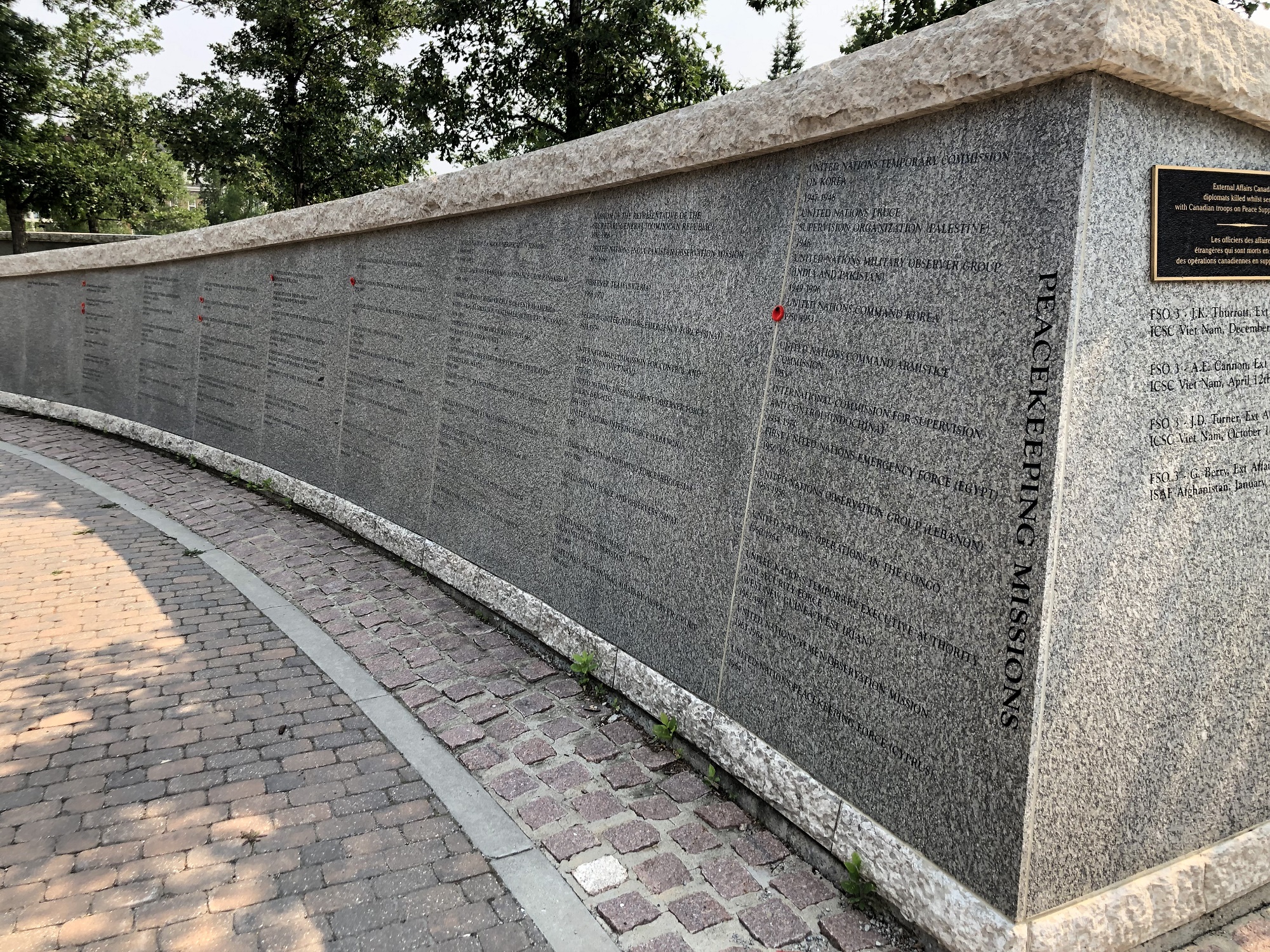 Le Mur des missions, achevé en 2004, répertorie les noms des missions de maintien de la paix du Canada. Le mur est revêtus de panneaux de granit avec des couronnements en pierre calcaire.
