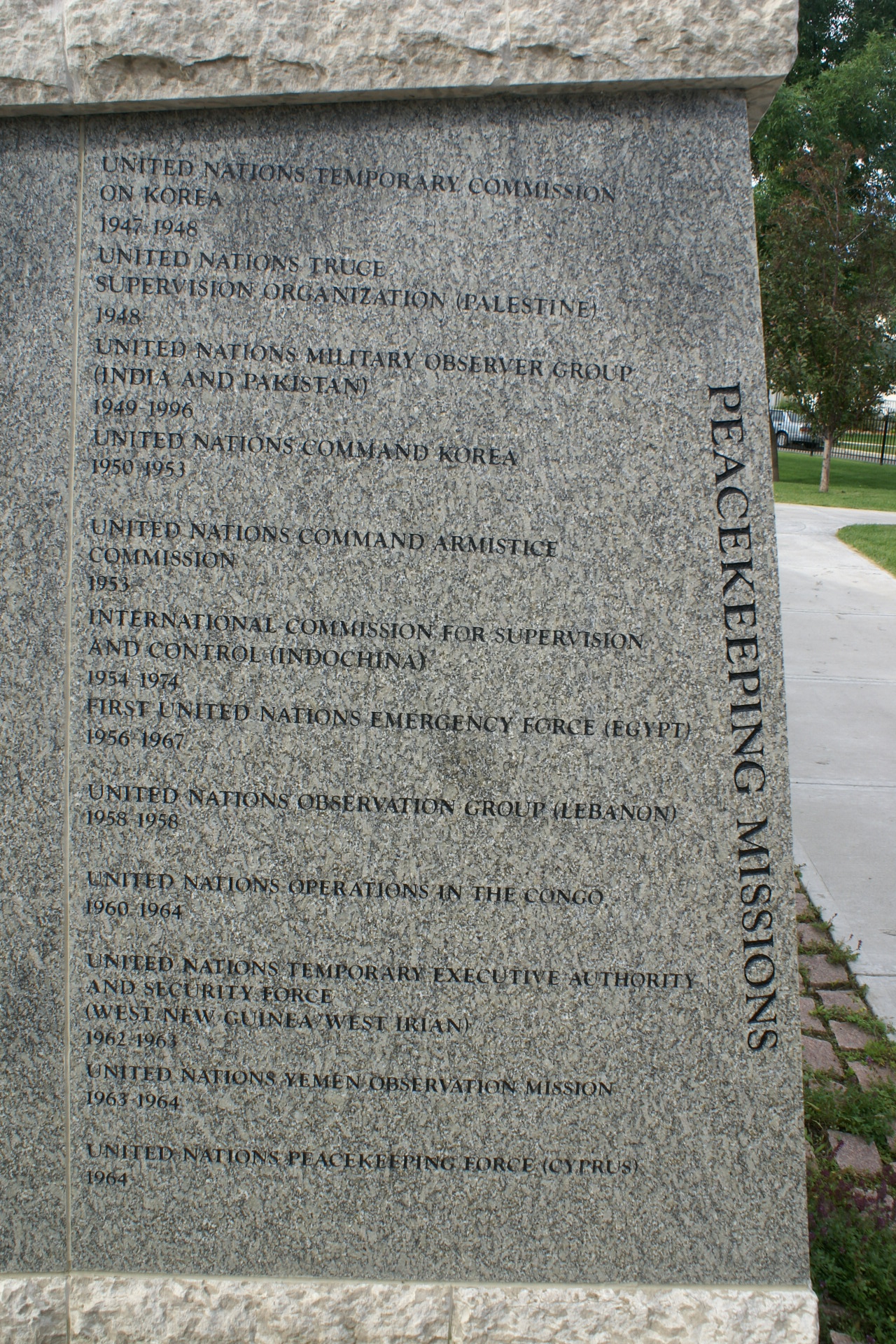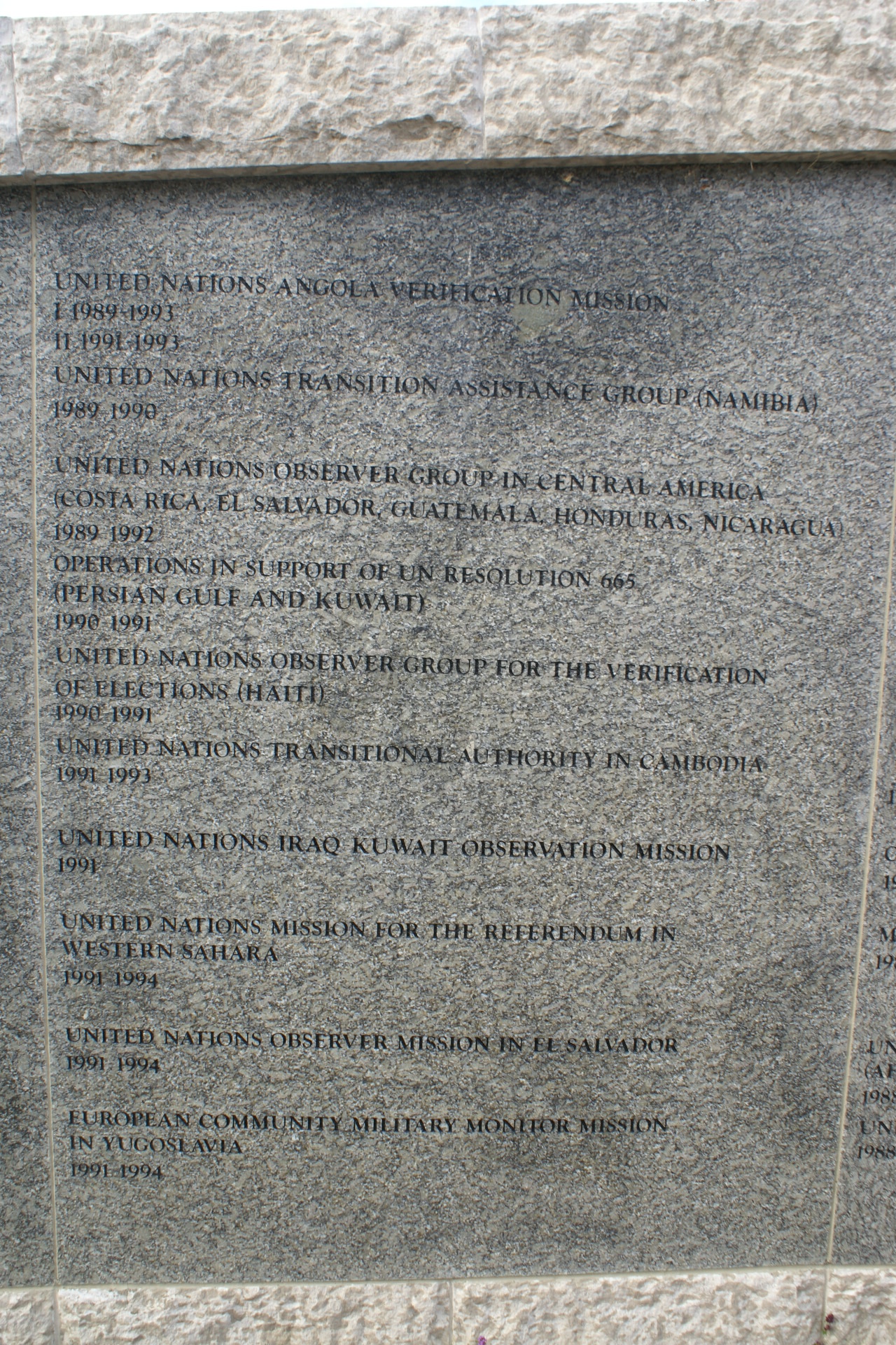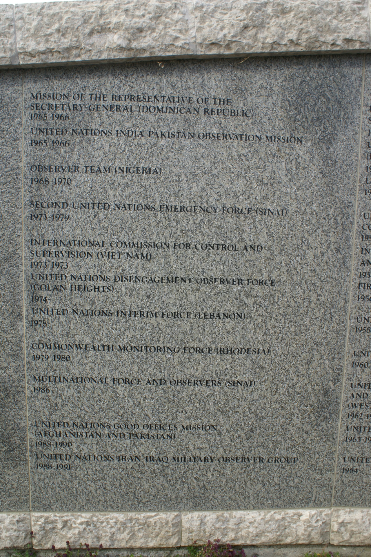 Le Mur des missions, achevé en 2004, répertorie les noms des missions de maintien de la paix du Canada. Le mur est revêtus de panneaux de granit avec des couronnements en pierre calcaire.