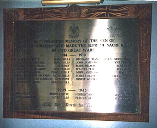 IN EVERLASTING MEMORY OF THE MEN OF MONO TOWNSHIP WHO MADE THE SUPREME SACRIFICE IN TWO GREAT WARS