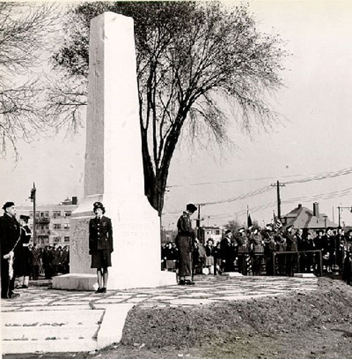 Le dernier gouverneur général britannique du Canada, le vicomte Alexander de Tunis, plus jeune major-général britannique pendant la Seconde Guerre mondiale, a inauguré le 24 octobre 1948 ce monument de granit de 19 pieds érigé en face de l’hôtel de ville. La cérémonie a eu lieu en présence du lcol Norman Mitchell, qui a mérité la Croix de Victoria au cours d’une bataille près de Cambrai en 1918.