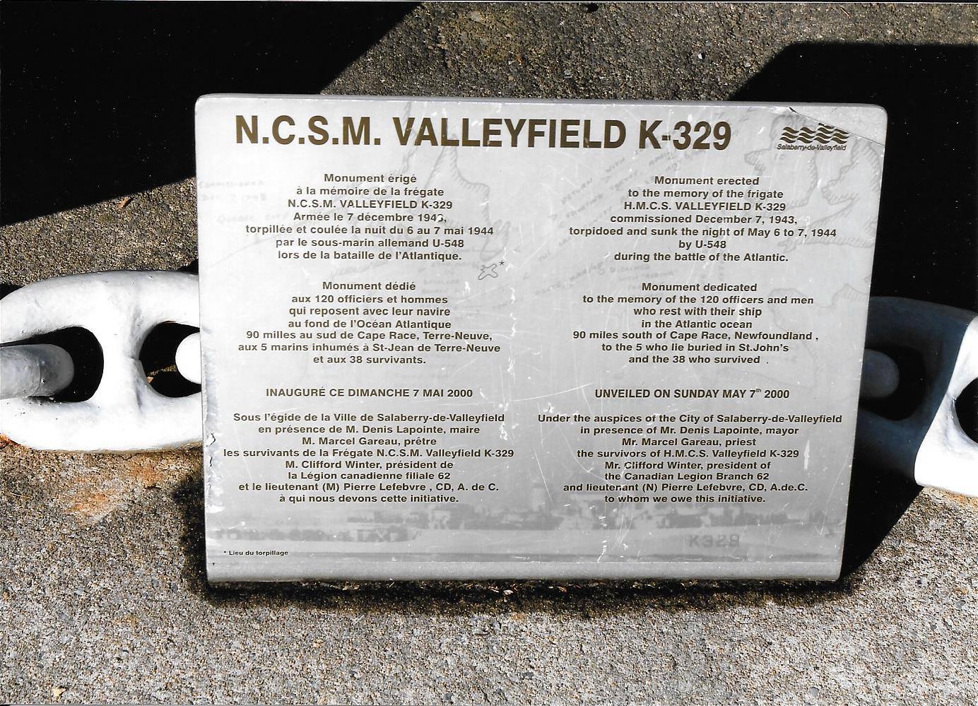 Ce monument est dédié à la bravoure, la détermination et le courage des membres de l’équipage du NCSM Valleyfield, coulé en 1944. Ce monument a été inauguré le 7 mai 2000. Une ancre du «destroyer» HMCS-Gatineau placée sur un bloc de ciment est la piece principale du monument. Une description du monument est gravée dans les deux langues officielles sur une plaque d'aluminium à la base du monument. Le monument a été créer en collaboration avec la ville de Valleyfield et l'ancre a été offerte par le gouvernement Canadien. Le projet de ce monument a été soumis par le Lieutenant de vaisseau, Pierre Lefebvre.CD et inauguré en présences des survivants de la NCSM-Valleyfield et d'un membre de U548, ainsi que divers dignitaires locaux et d'autres officels.